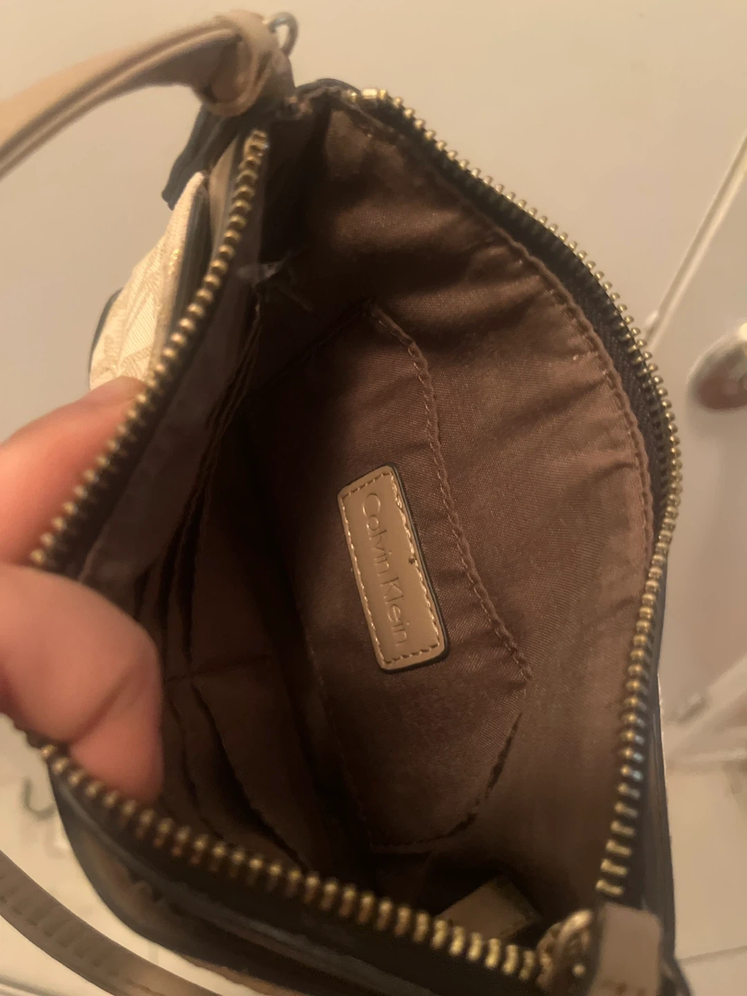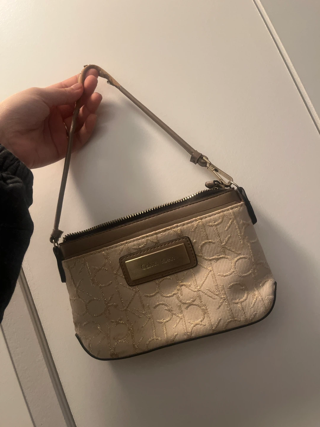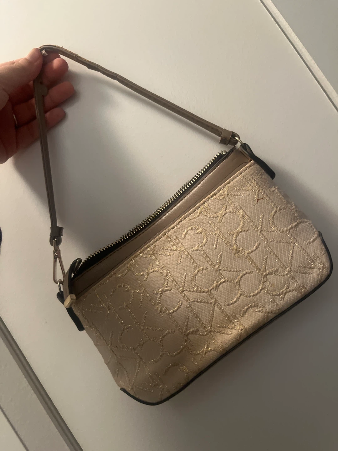 Cute Calvin Klein mini bag in beige with the CK logo pattern. It's a small, stylish bag, perfect for carrying essentials. Please note the strap has some wear and tear. But works perfectly fine! E transfer or cash only. Pick up only.