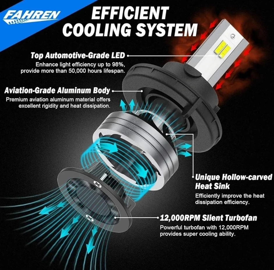 Selling a pair of Fahren H13/9008 LED headlight bulbs. They are super bright and waterproof with a 6500K cool white IP68 rating. These bulbs are designed to ensure wider and further lighting area, so you don't blind oncoming traffic. They work with 98% of vehicle's computer systems without error warning or flickering. The efficient cooling system enhances light efficiency up to 98% and provides more than 50,000 hours lifespan.