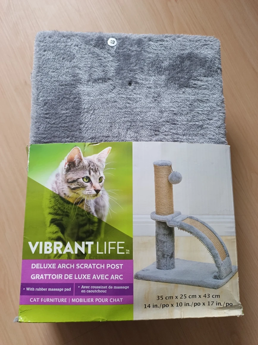 Selling a Vibrant Life deluxe arch scratch post for cats! It's in great condition and comes with the original box. This cat furniture features a rubber massage pad for extra comfort. Dimensions are 35 cm x 25 cm x 43 cm (14 in. x 10 in. x 17 in.)