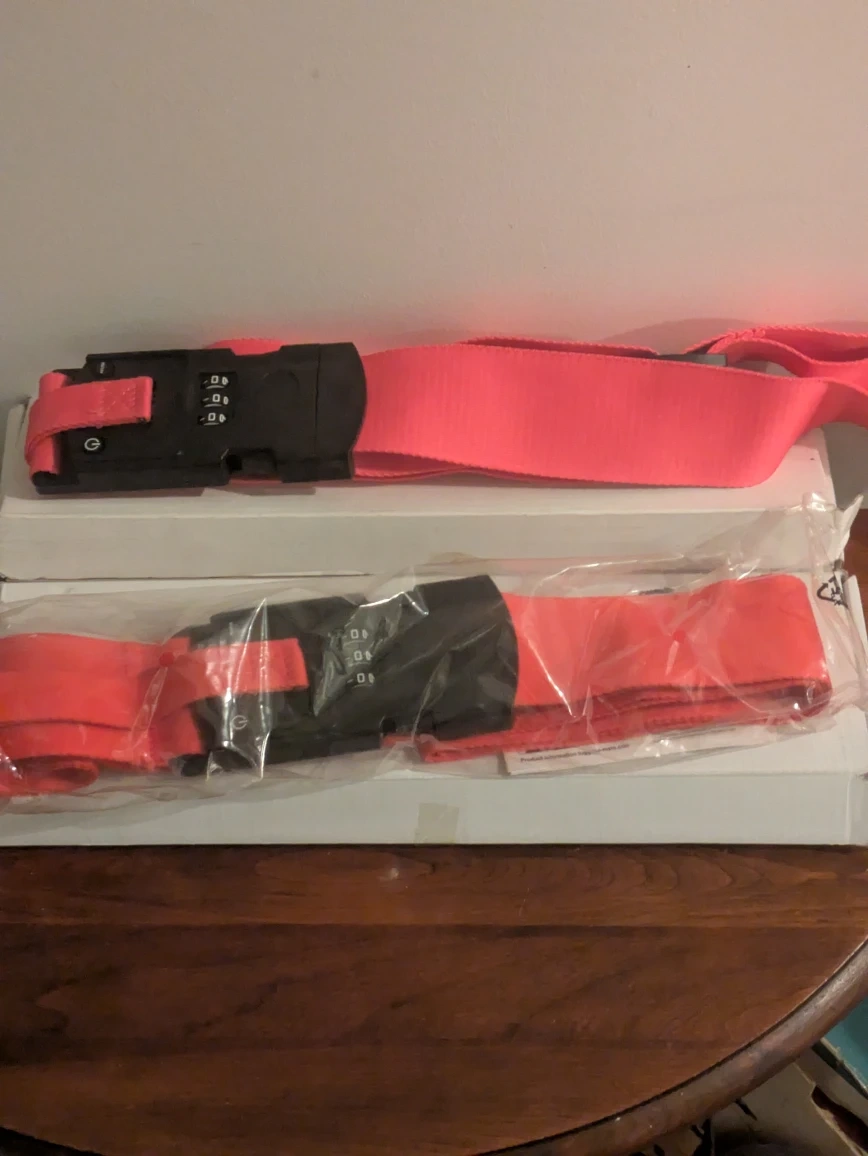 Here's a luggage strap in a vibrant pink colour! It features a combination lock to keep your luggage secure while you travel. It's in new condition and ready for your next trip!