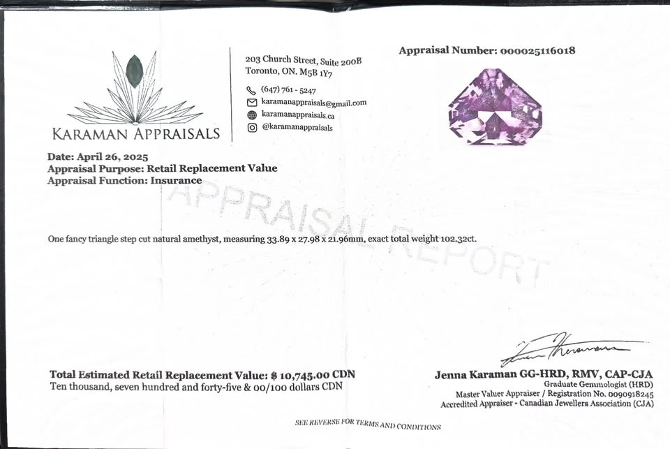 $5 per carat rounded down. This is an incredible price for a beautiful faceted amethyst. Display this as a statement piece or set it in a pendant for a jaw-dropping piece of jewellery. Gorgeous faceted amethyst. 102.32 carats. Insurance appraisal valued at $10,745. Cash only please. Pickup at agreed upon location.