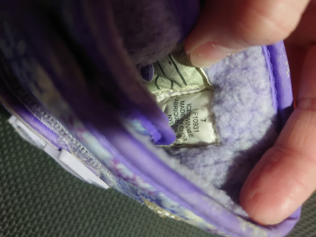 Here are a pair of Icicles winter boots in a size 7. They are purple and white with a snowflake pattern. Perfect for keeping your little one's feet warm and dry this winter!
