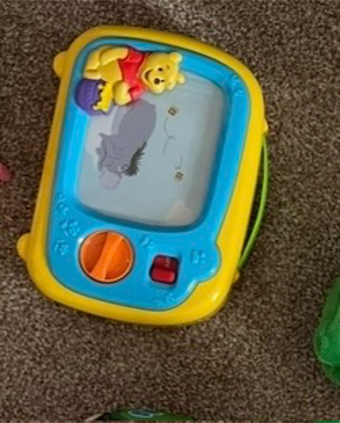 Turning the orange dial on the front plays music and scrolls through different pictures featuring Winnie the Pooh and friends.