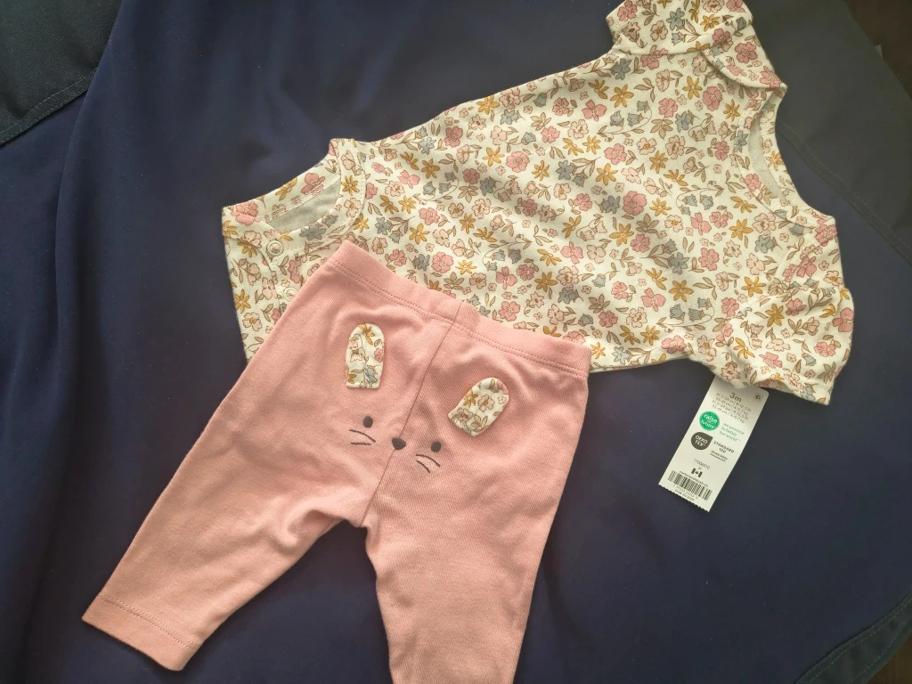 Super cute Carter's baby outfit in size 3 months! Includes a floral top and pink pants with a sweet little cat design on the back. Perfect for your little one!