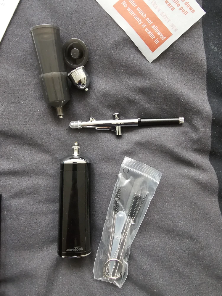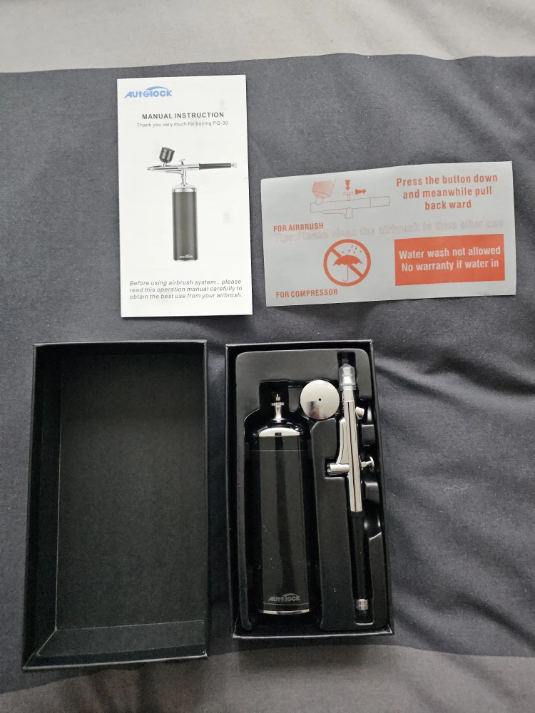 Portable Auto Airbrush kit with Battery powered Compressor. Was going to use for model kit painting, but never got the chance to use. Like new. All accessories included. Good for small jobs.