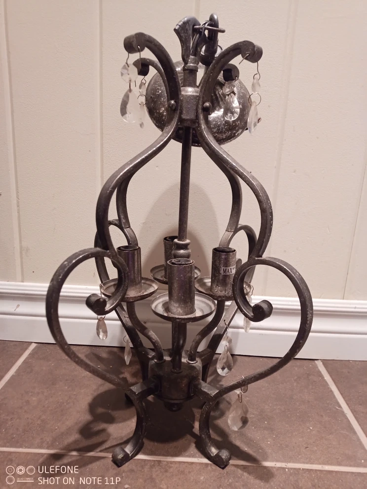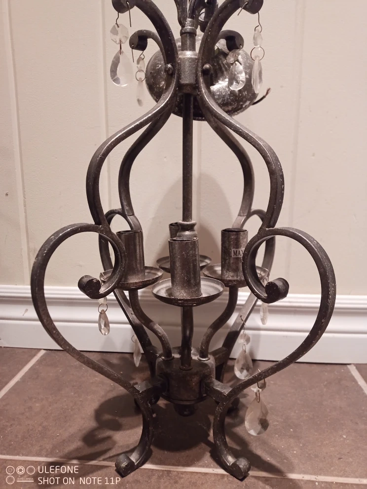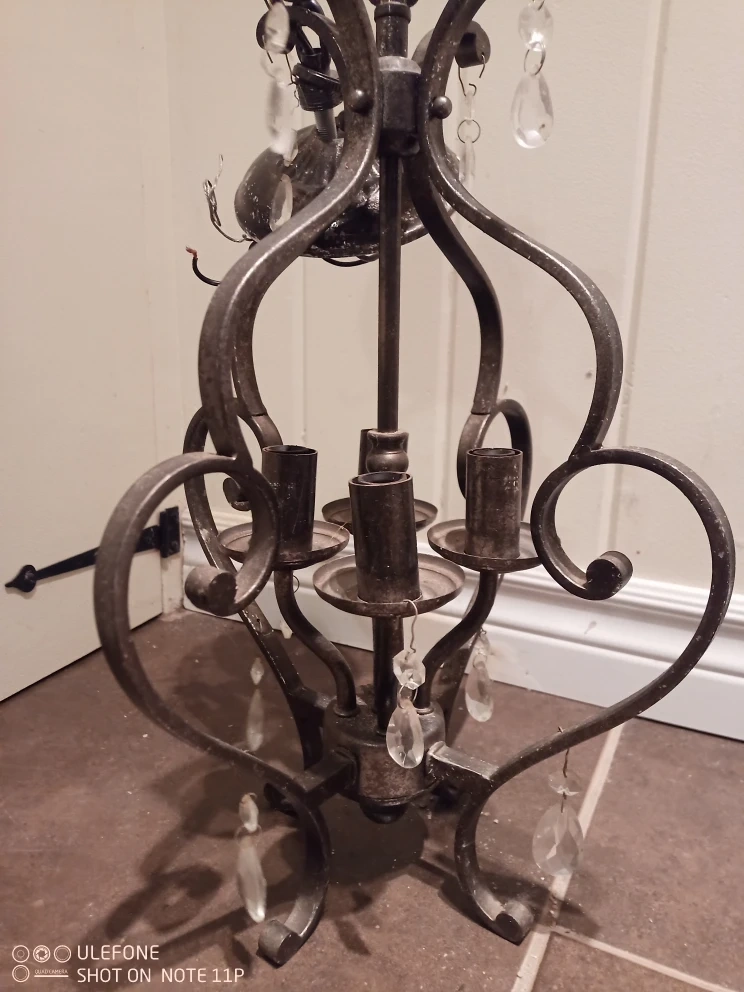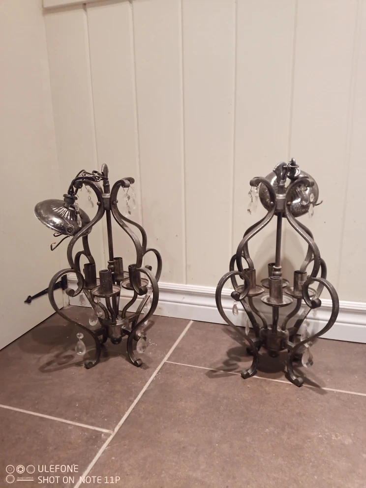 Selling a pair of ceiling metal rod iron light fixtures They have a rustic, wrought-iron look with decorative crystal accents. Perfect for adding a touch of vintage charm to your home decor!