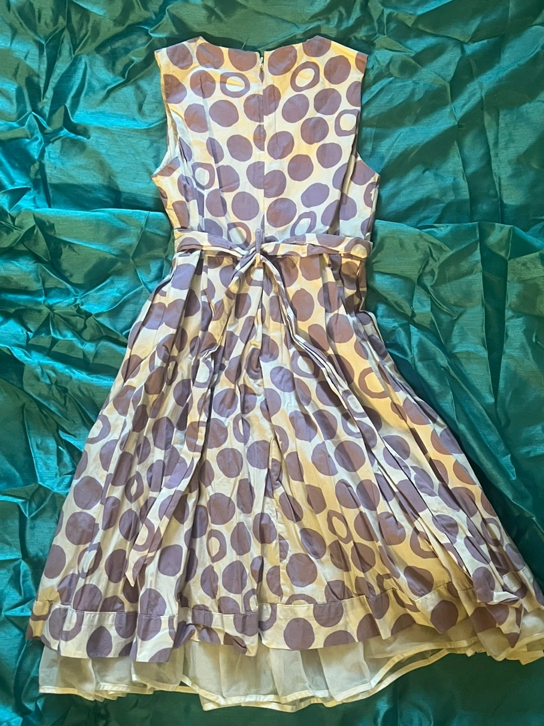 Selling a cute dress. It features a fun purple polka dot pattern and comes with a matching belt. The dress is a size 10 and in great condition, perfect for any occasion