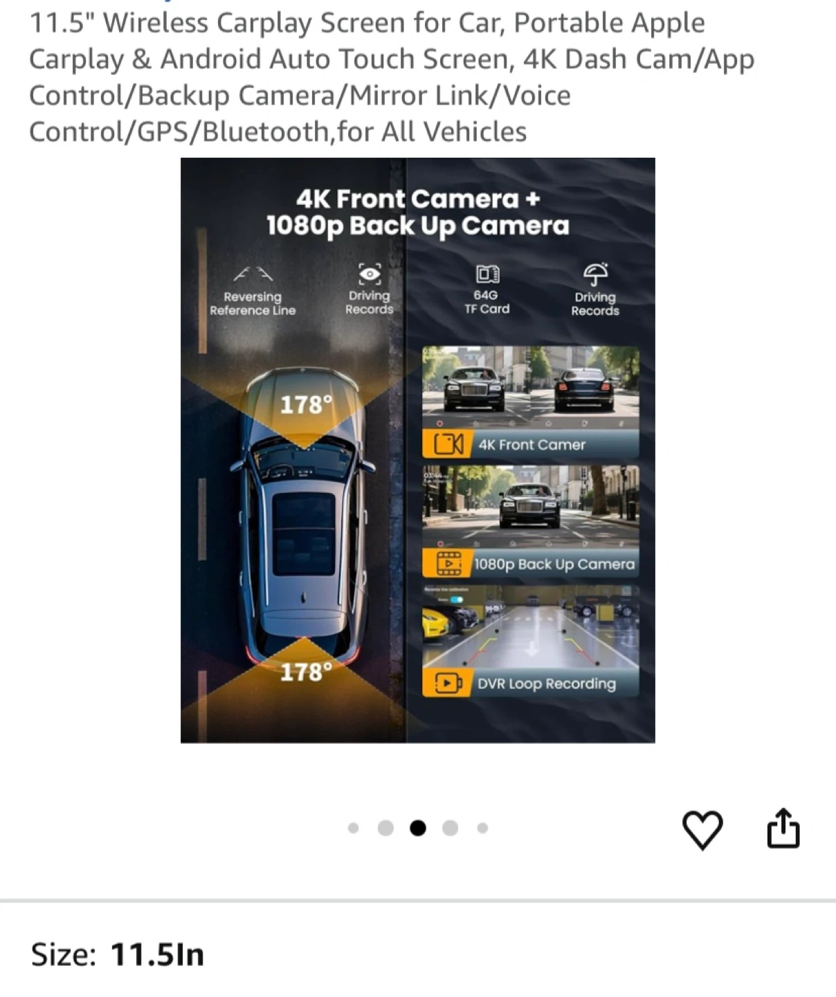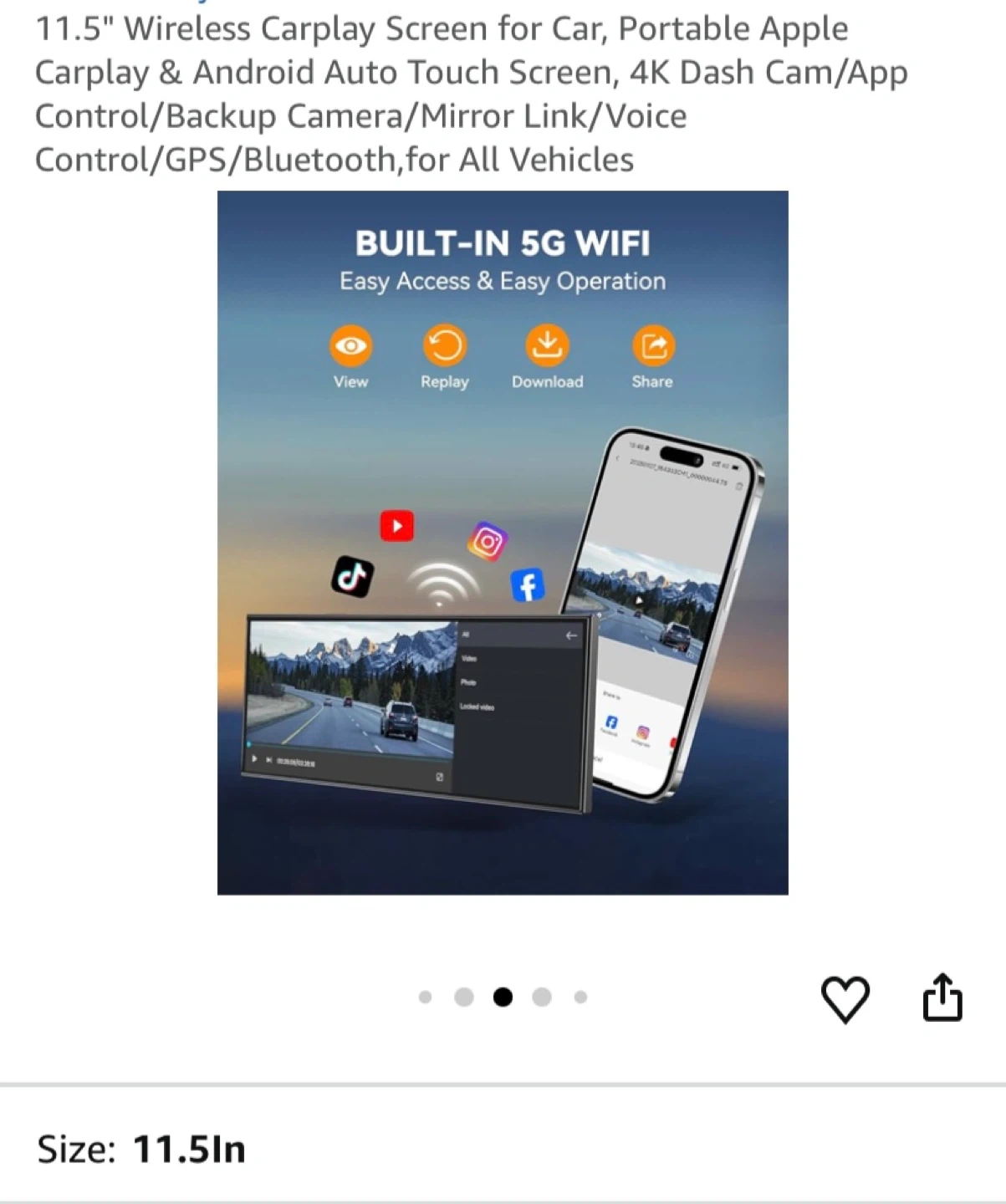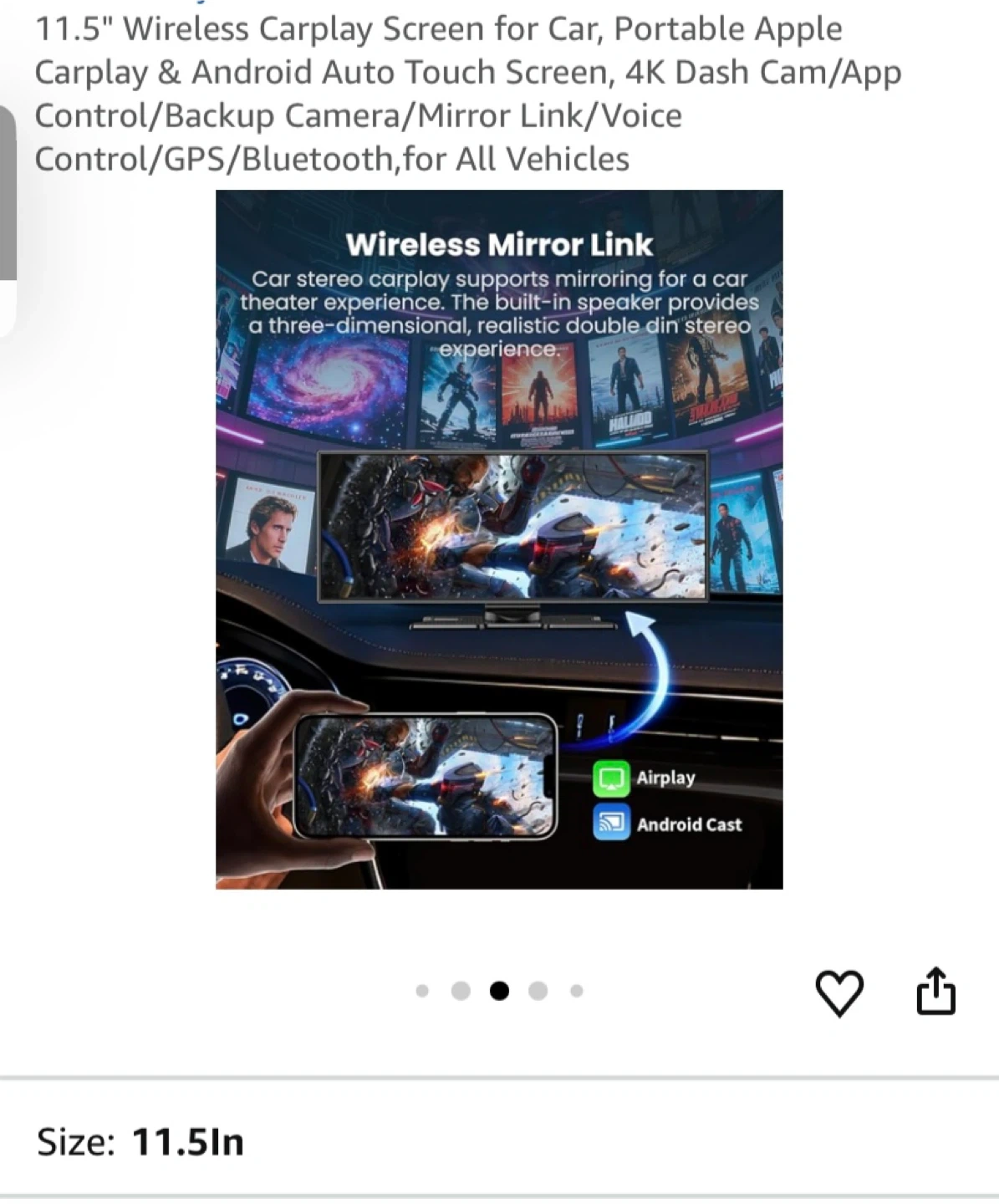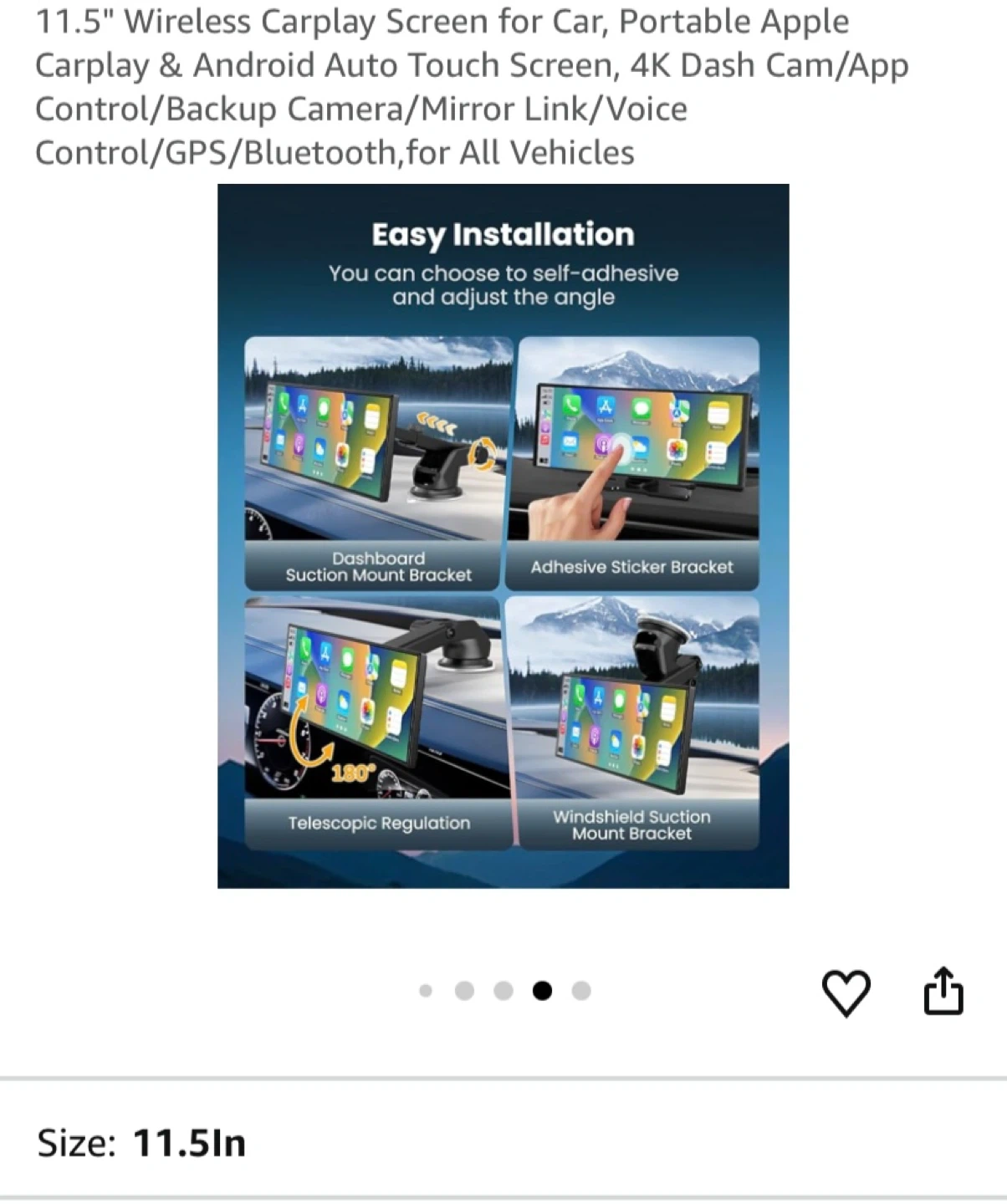 Selling an 11.5 inch wireless Carplay screen! It's a portable Apple Carplay and Android Auto touch screen that also features a 4K dash cam and app control. It also has mirror link and voice control. Perfect for any vehicle!