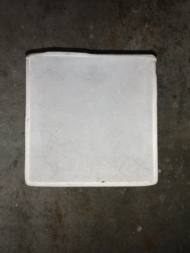 Selling a white fabric storage cube with a grid pattern. It's in good condition and comes with a solid white bottom insert. Perfect for organizing your space!