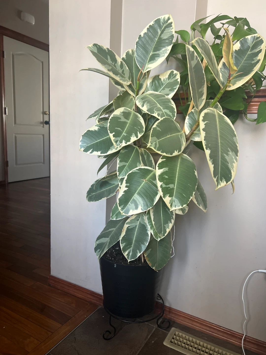 Selling a beautiful variegated rubber plant! It's a great way to add some greenery to your home. The leaves have a lovely green and white pattern. The plant is in a black pot and ready to be enjoyed