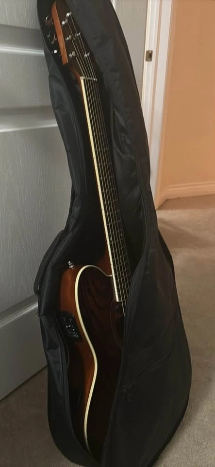 Great condition, plays well, and has a built-in pickup for plugging in. Comfortable neck and nice warm tone. No marks or issues.