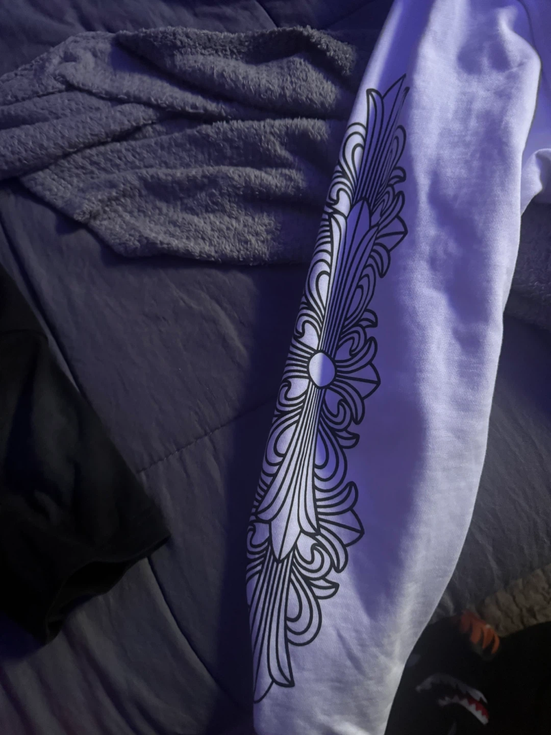 Selling a Chrome Hearts hoodie in white. It features a unique design on the sleeves and back. Perfect for adding a stylish touch to your wardrobe!