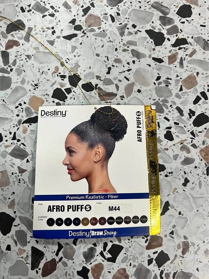 Destiny Beauty Elements “Afro Puff” drawstring hair bun, color-coded M44, made with premium realistic synthetic fiber and secured with a drawstring. Perfect for easy, stylish buns with vegan-friendly flair!