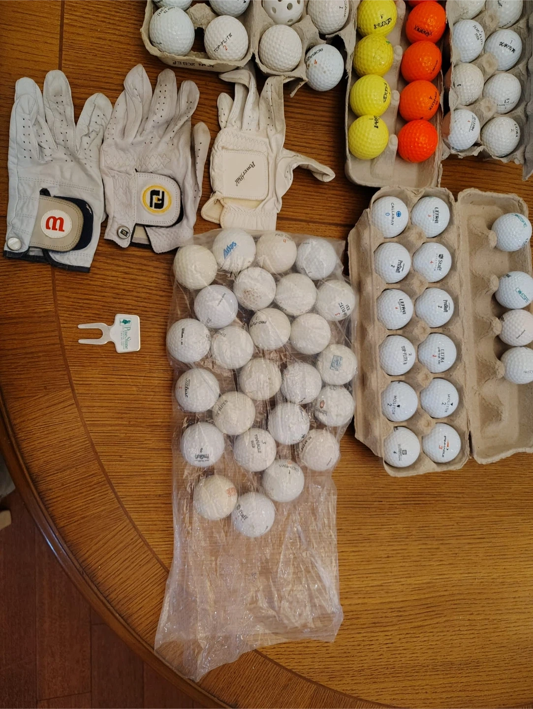 Selling a variety of golf balls and golf gloves. Stock up for spring and give new balls to a golfer for the holidays. There are a few different brands of golf balls including Callaway, Pro Staff, and Titleist. There are also a few golf gloves including FootJoy and Wilson.