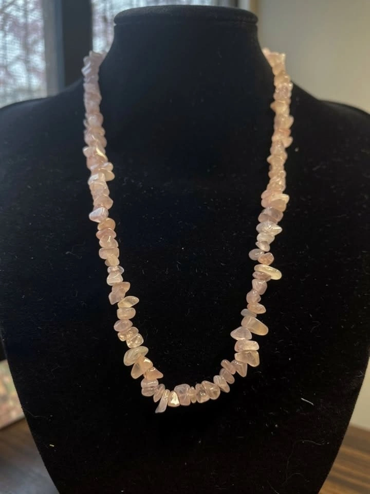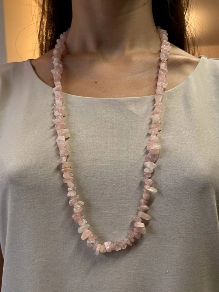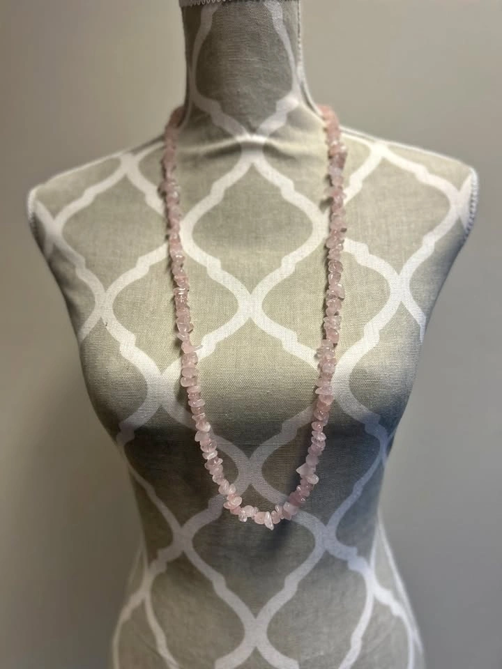 Bring soft elegance and positive energy to your look with this rose quartz chip necklace. Made from natural rose quartz stones in delicate shades of pink, this piece is perfect for gemstone lovers and bohemian style enthusiasts.