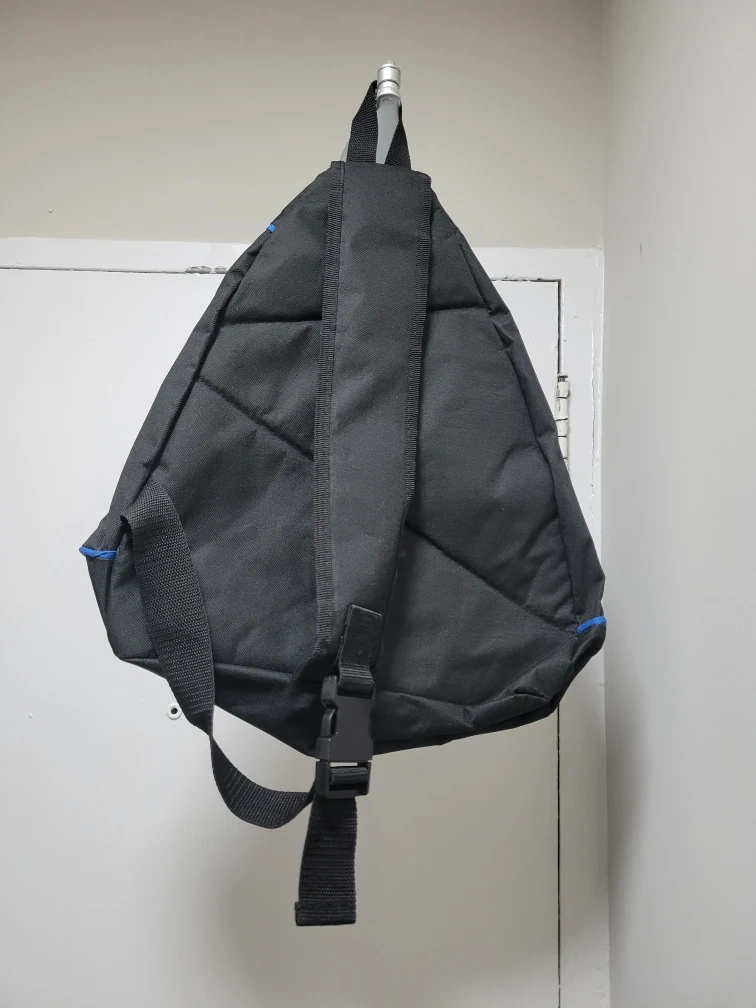 Here's a sling bag from Invesco! It's black with blue trim and has a unique triangular shape. Perfect for carrying your essentials on the go!
