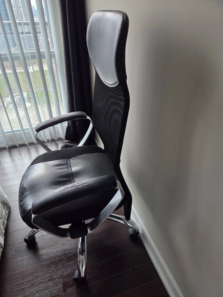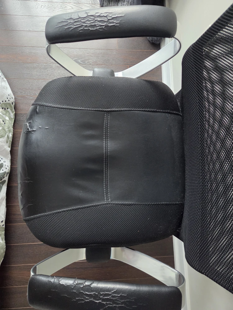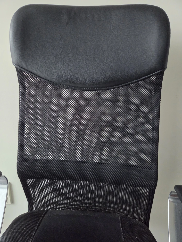 Selling a black ergonomic office chair. It has a mesh back and leather seat. There are some signs of wear on the seat and armrests, as shown in the photos. Still functional and comfortable!