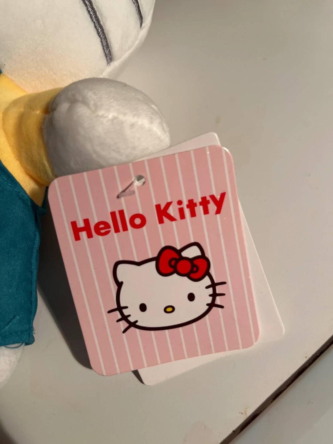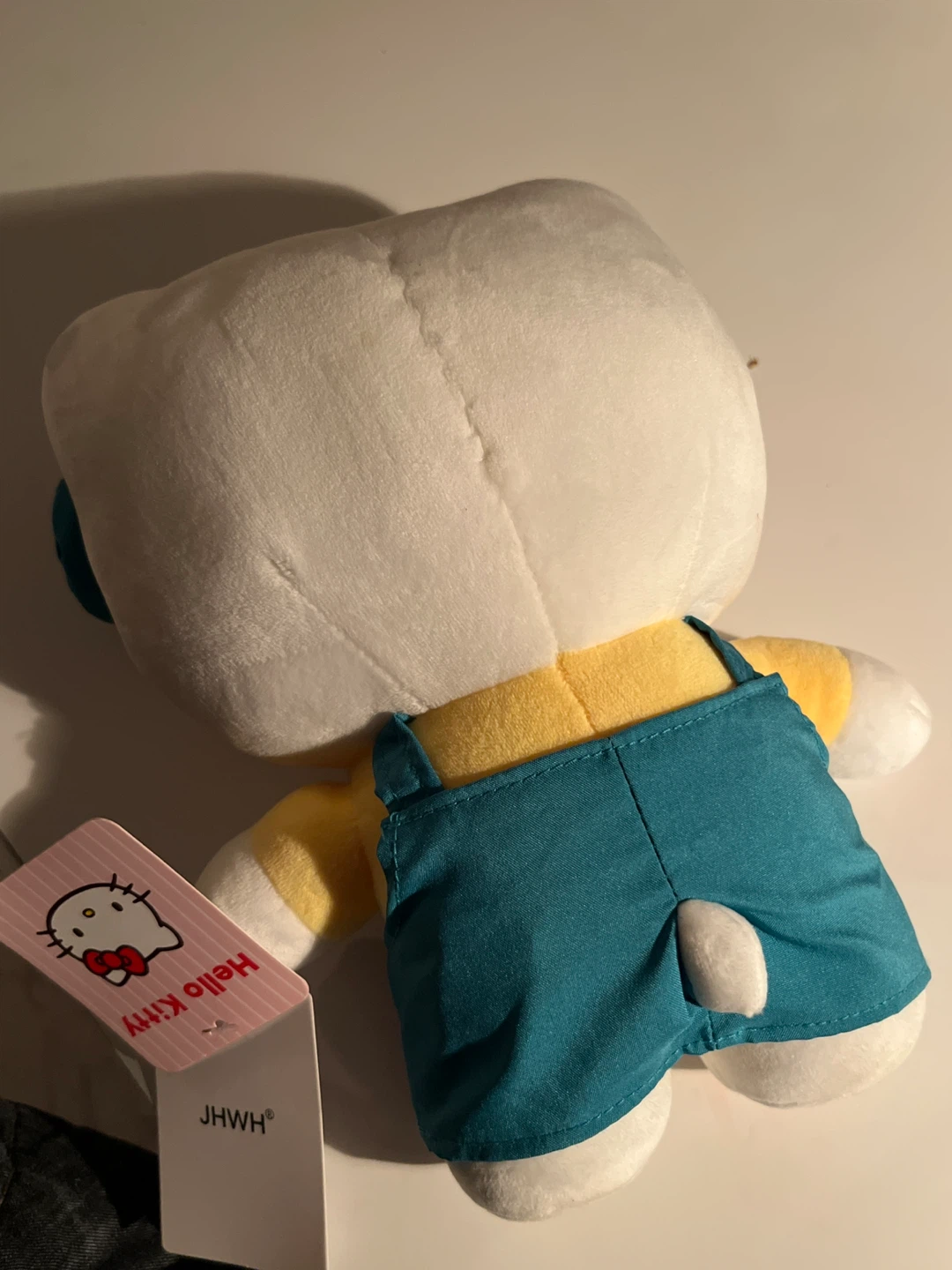 Selling a super cute Hello Kitty plushie! It's brand new with tags still attached. The plushie is wearing a blue and yellow outfit and has a matching bow. Perfect for any Hello Kitty fan!