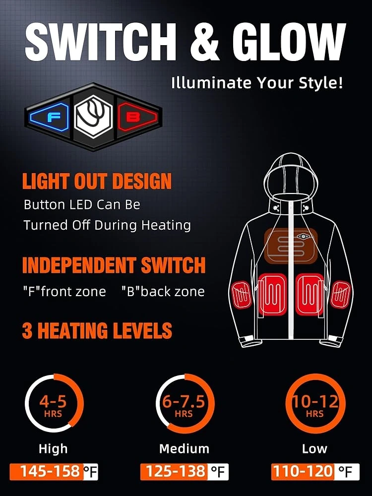 Stay warm and comfy with this WASOTO heated jacket! It's designed to be windproof and water-resistant, perfect for those chilly Canadian days. The jacket features independent switches for the front and back zones, and you can adjust between 3 heating levels to get just the right amount of warmth. Plus, the button LED can be turned off during heating for a light-out design. It also comes with a power bank for charging!