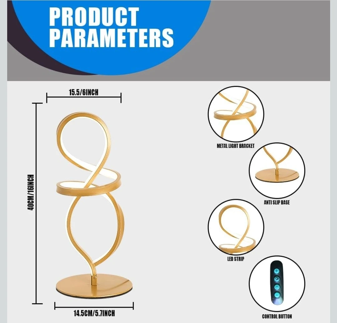 This is a gold desk lamp with a unique dancer shape. It's a dimmable bedside table lamp that's perfect for the bedroom, living room, or home office. It has button one-touch control, and you can choose between 30%, 60%, and 100% brightness. The lamp is 15W and has 3 color temperatures. It is 40cm/16inch tall and 14.5cm/5.7inch wide.