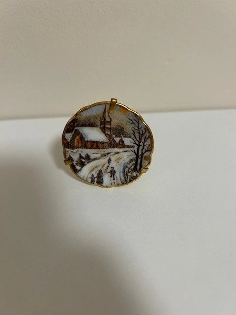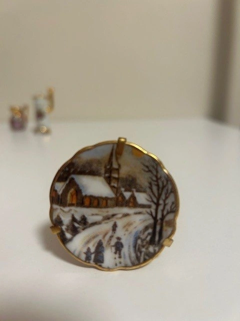 1 Limoges Miniature Plate – Winter Village Scene; Hand-painted snowy village with church and figures; Authentic Limoges France stamp i