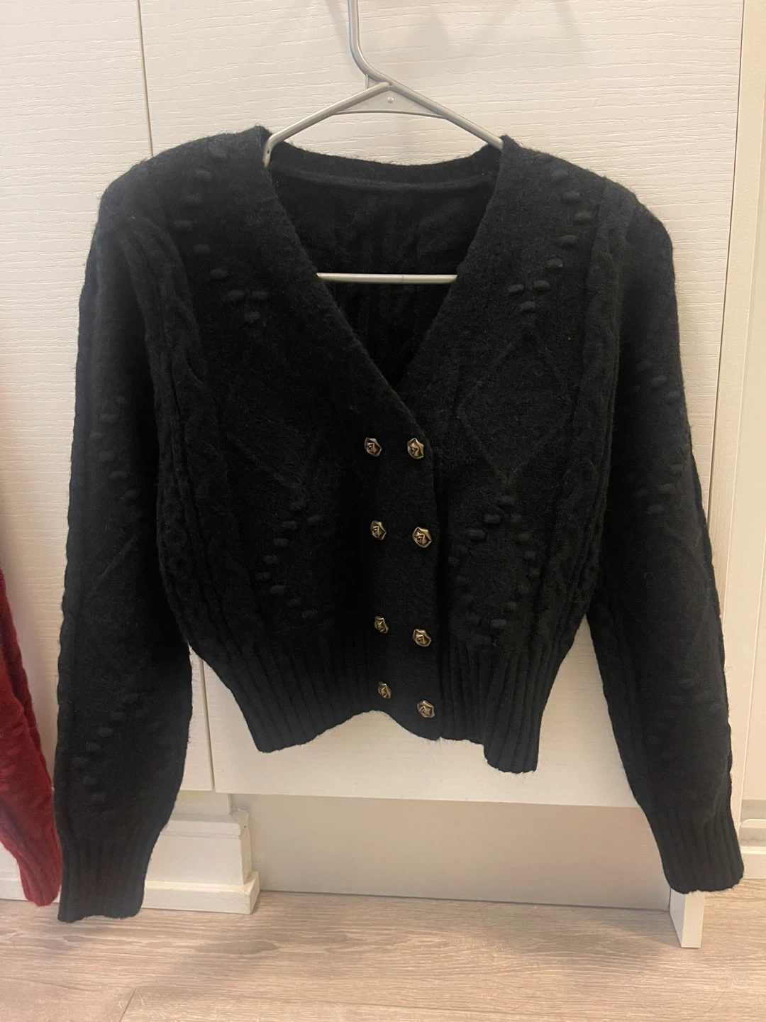 Selling a cute black knit cardigan! It has a V-neck and gold-tone buttons. It's in great condition and perfect for layering on those chilly days. β€’ πŸ–€ Black β€” Brand New $8 Not negotiable!!! ✨ Features β€’ Soft, warm chunky knit material β€’ Gold-tone decorative buttons β€’ Cropped, flattering silhouette β€’ Unique textured pattern (Korean design) β€’ Not sold in Canada β€’ Removable shoulder pads (optional structured look) πŸ“ Pick-up: Wellesley Station (Downtown Toronto)