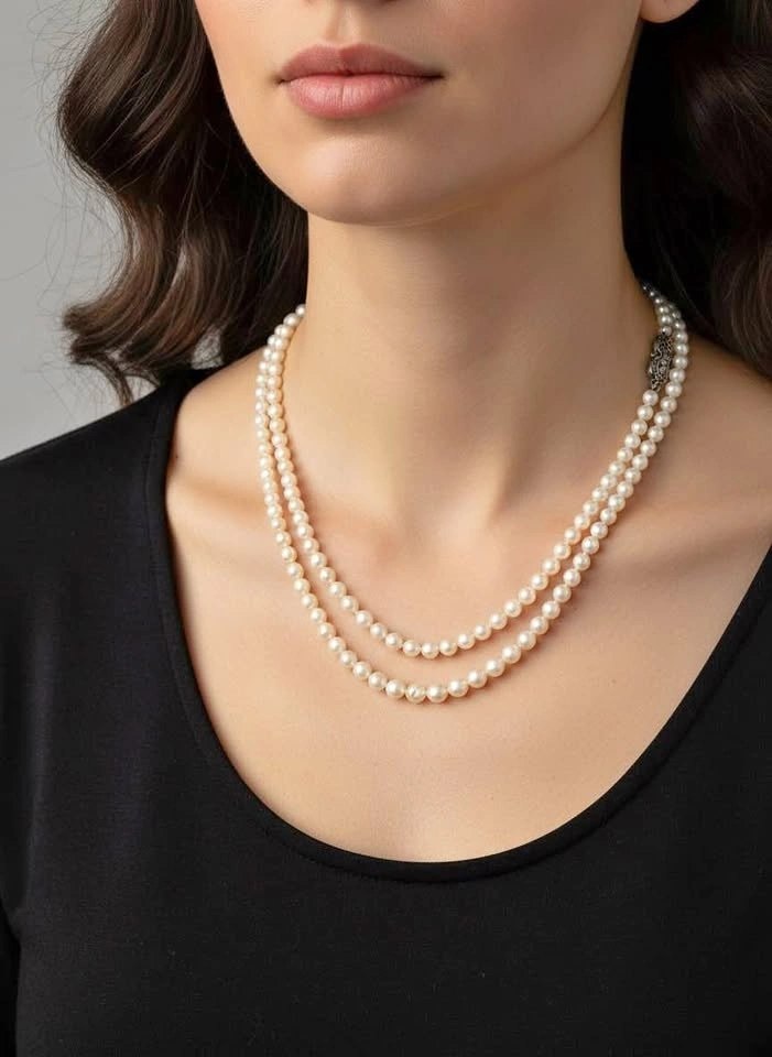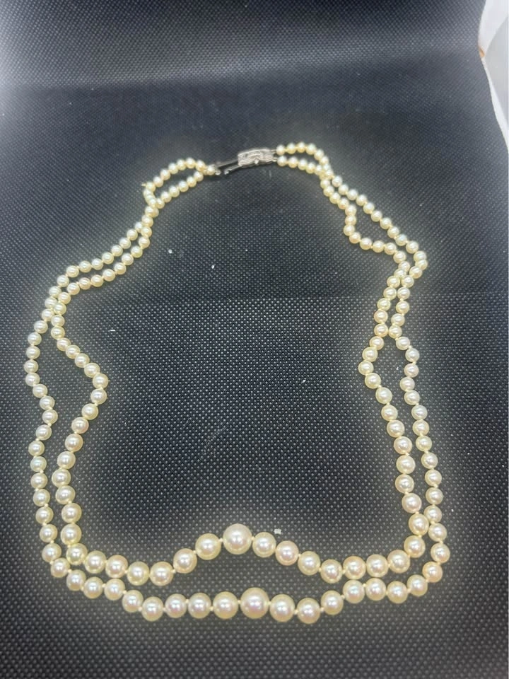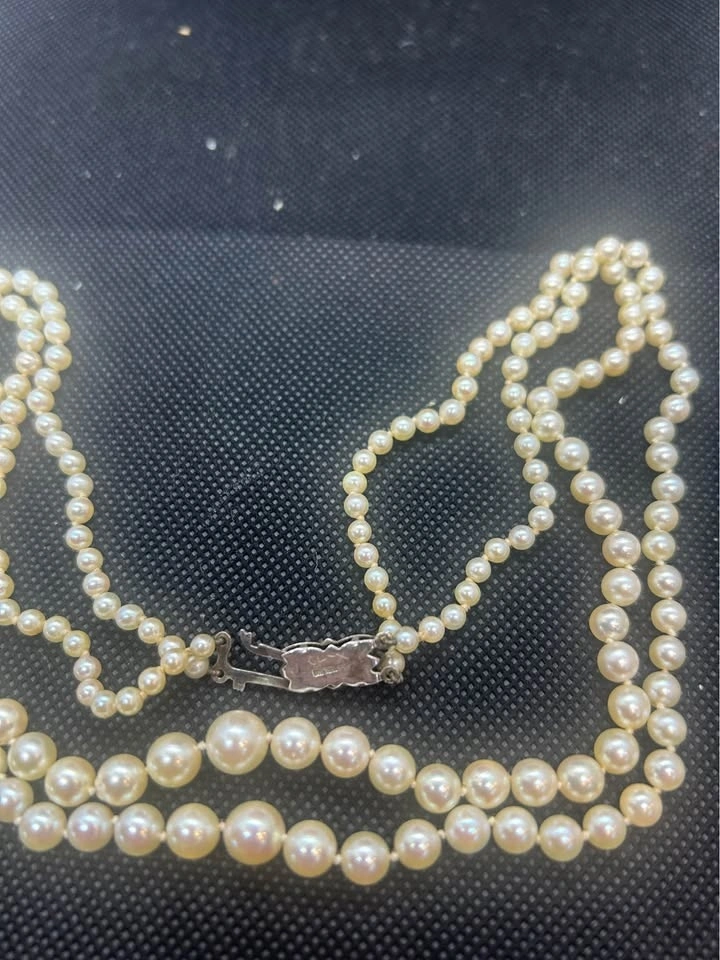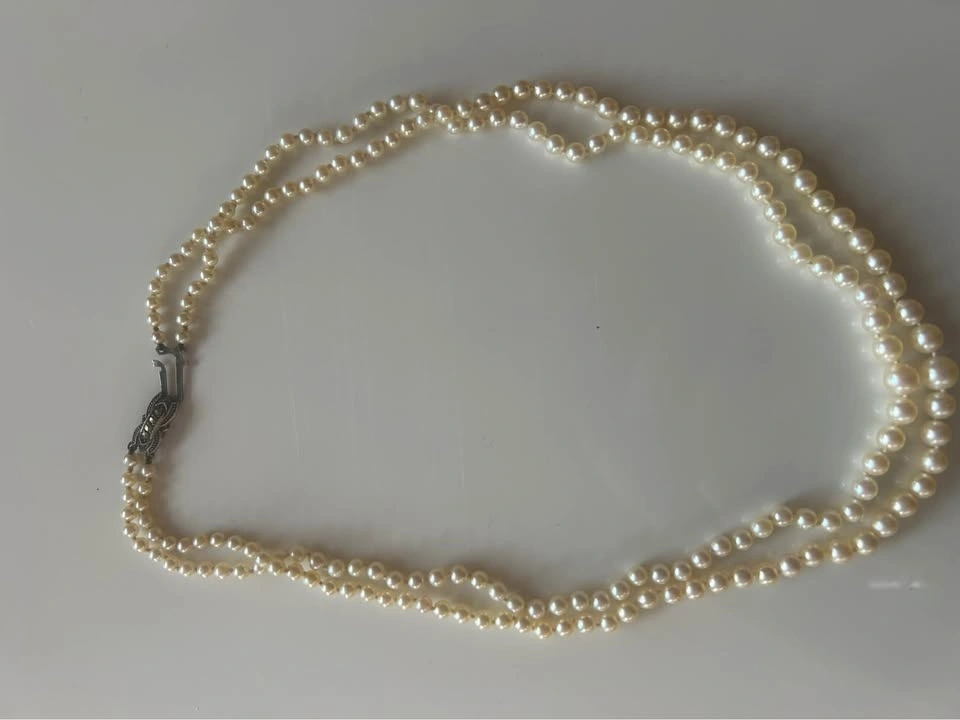 Beautiful vintage double-strand treated pearl necklace, featuring an ornate sterling silver box clasp. This piece was found at an estate sale and professionally verified by a jeweler as treated pearls, ensuring authenticity and quality.