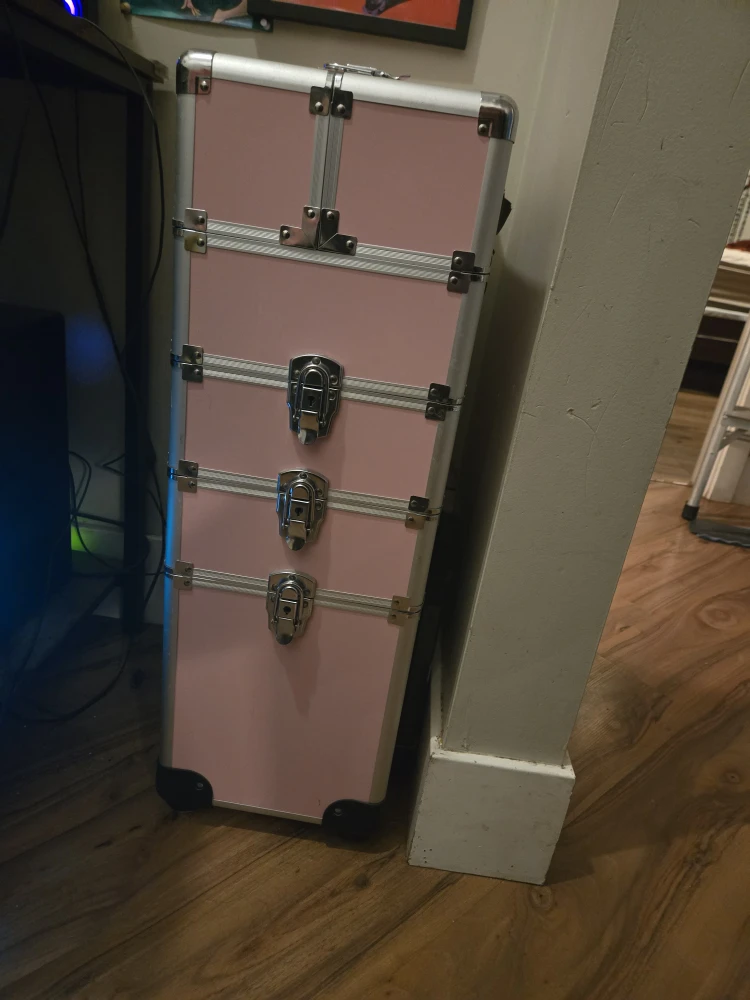 Selling a pink rolling makeup case! It's in good condition and perfect for storing all your cosmetics and beauty supplies. Great for travel or keeping everything organized at home