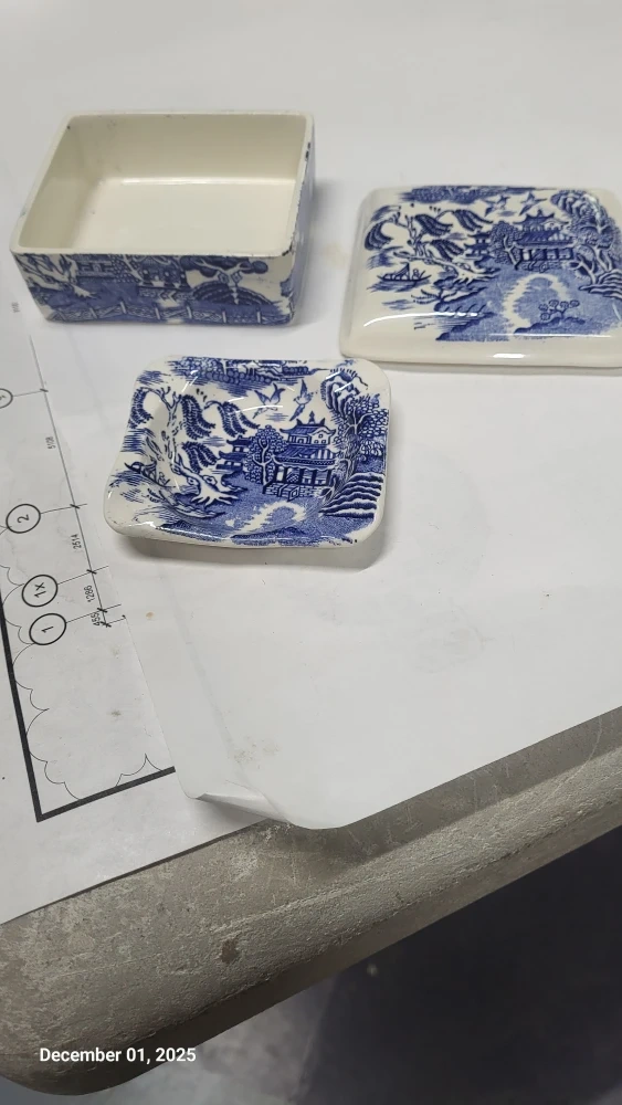 This is a beautiful Royal Alma Blue Willow cigarette bix abd ashtray, made in England! It has a pretty blue and white design. It comes with the box and a little tray that fits inside. Rare set. Really good condition.