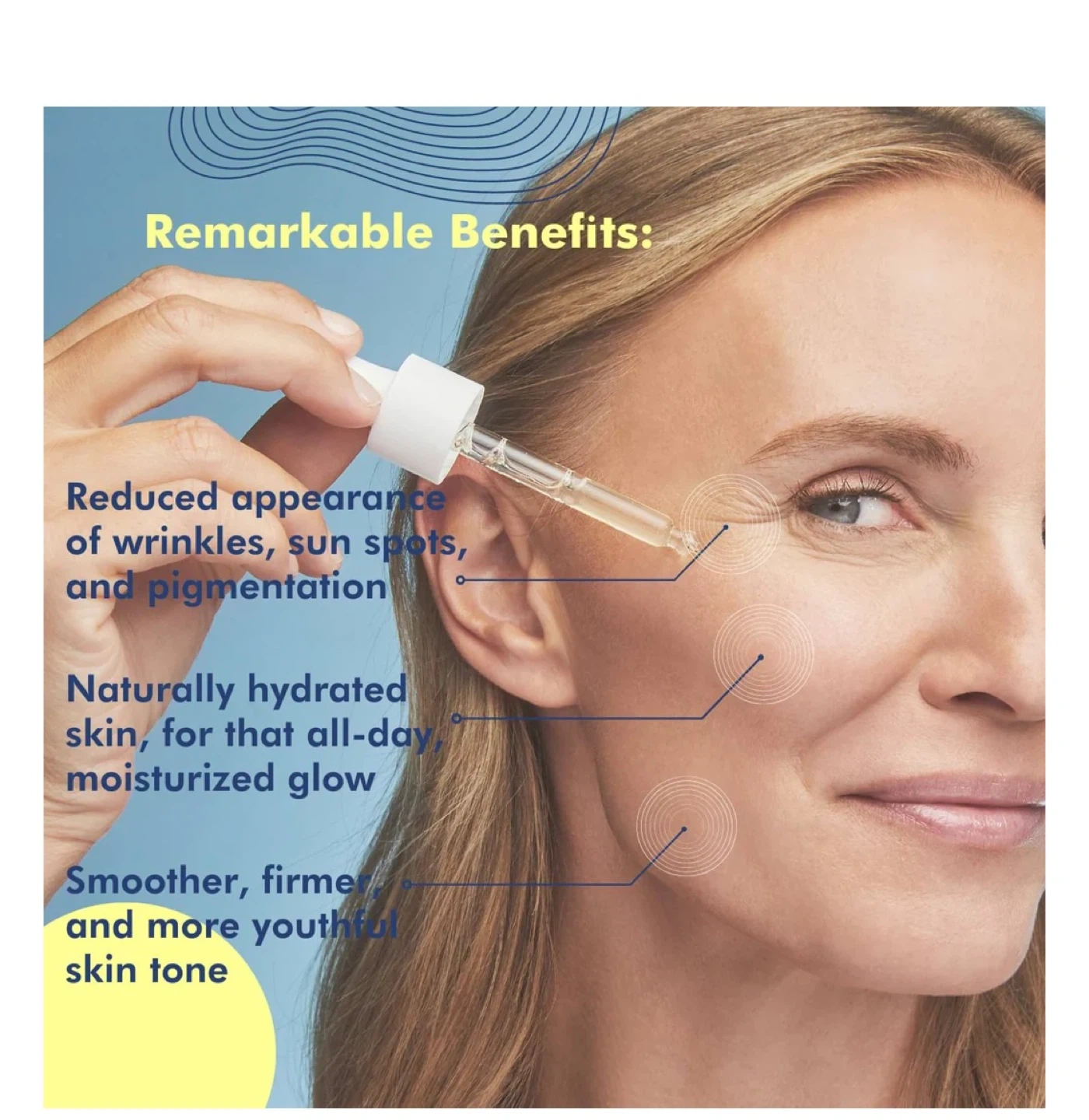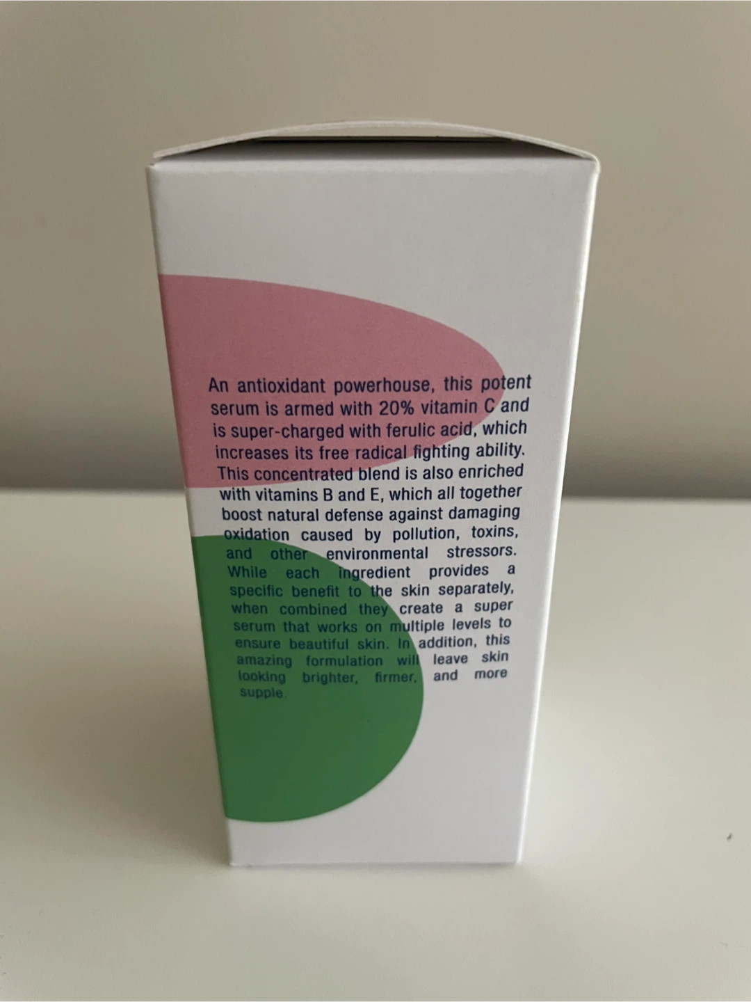 Key ingredients include 20% Pure Vitamin C, 1% Vitamin B, 1% Vitamin E, and 0.5% Ferulic Acid. It can help reduce wrinkles, sun spots, and pigmentation, while naturally hydrating skin for an all-day glow. It also promotes smoother, firmer, and more youthful skin tone.