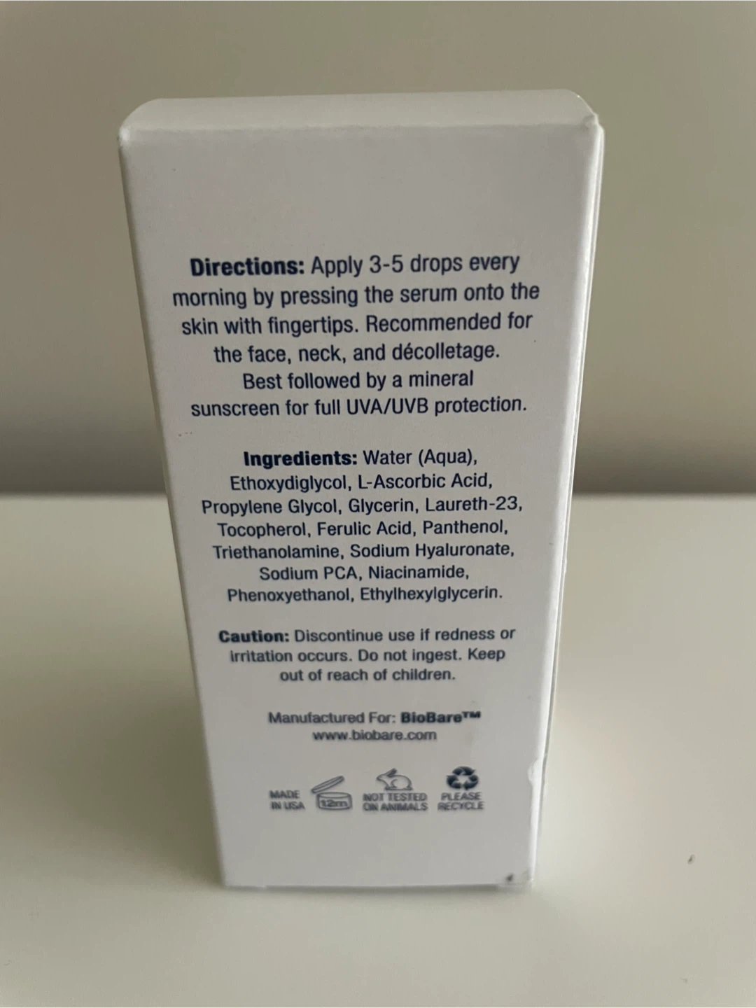 I'm selling a BioBare Vitamin C, B, E & Ferulic Serum. It's a self-stabilizing antioxidant that provides dual-action moisture and unrivaled efficacy.