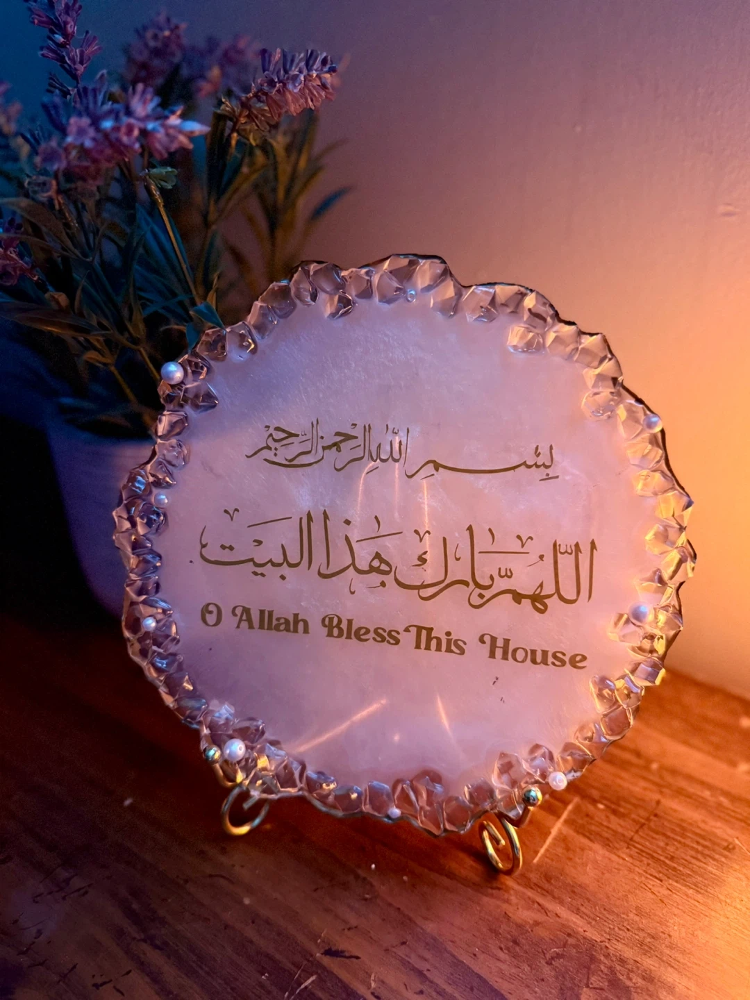 Beautiful handmade resin décor plate with gold Arabic calligraphy and a crystal-style crushed glass border. Comes with a gold metal stand — perfect for home décor, gifts, or entryway display.