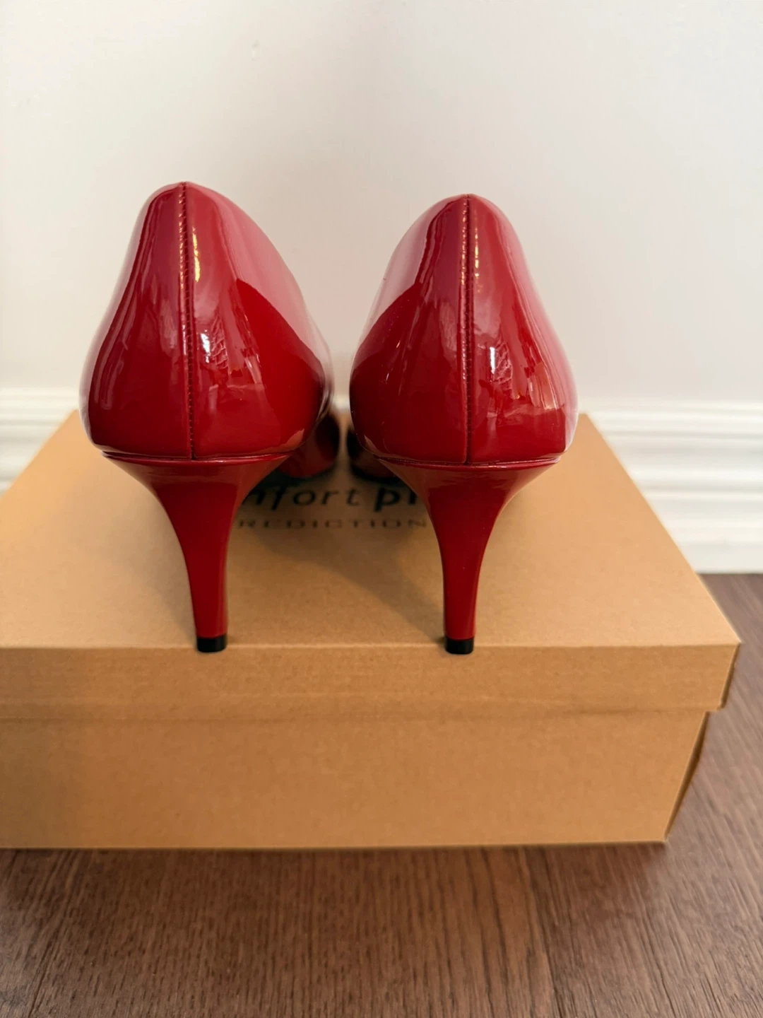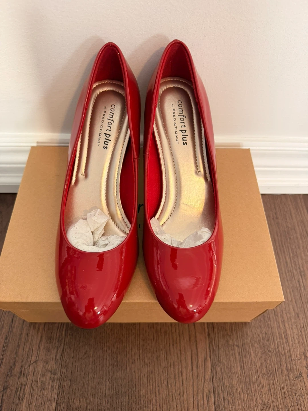 Selling a pair of Comfort Plus by Predictions heels in a vibrant red! These are a size 7 and come with the original box. They have memory foam insole and flexible outsole. They’re so comfortable, it’s unbelievable!! They're perfect for adding a pop of colour to any outfit!