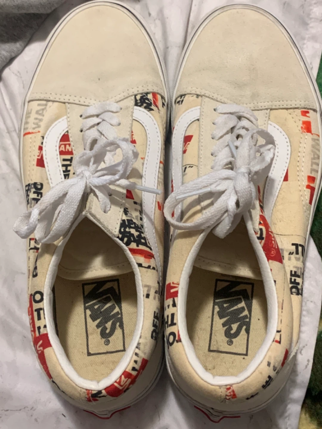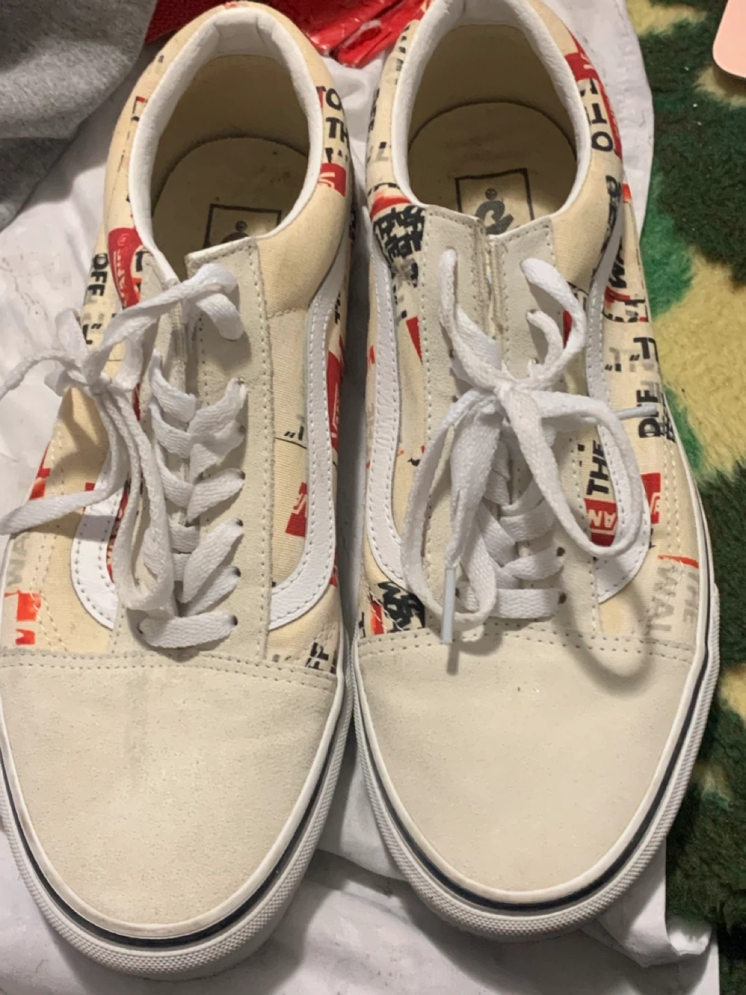 Vans Old Skool sneakers in a cream, red & black colourway. They are in great condition & are a size 9 (US). Perfect for everyday wear!