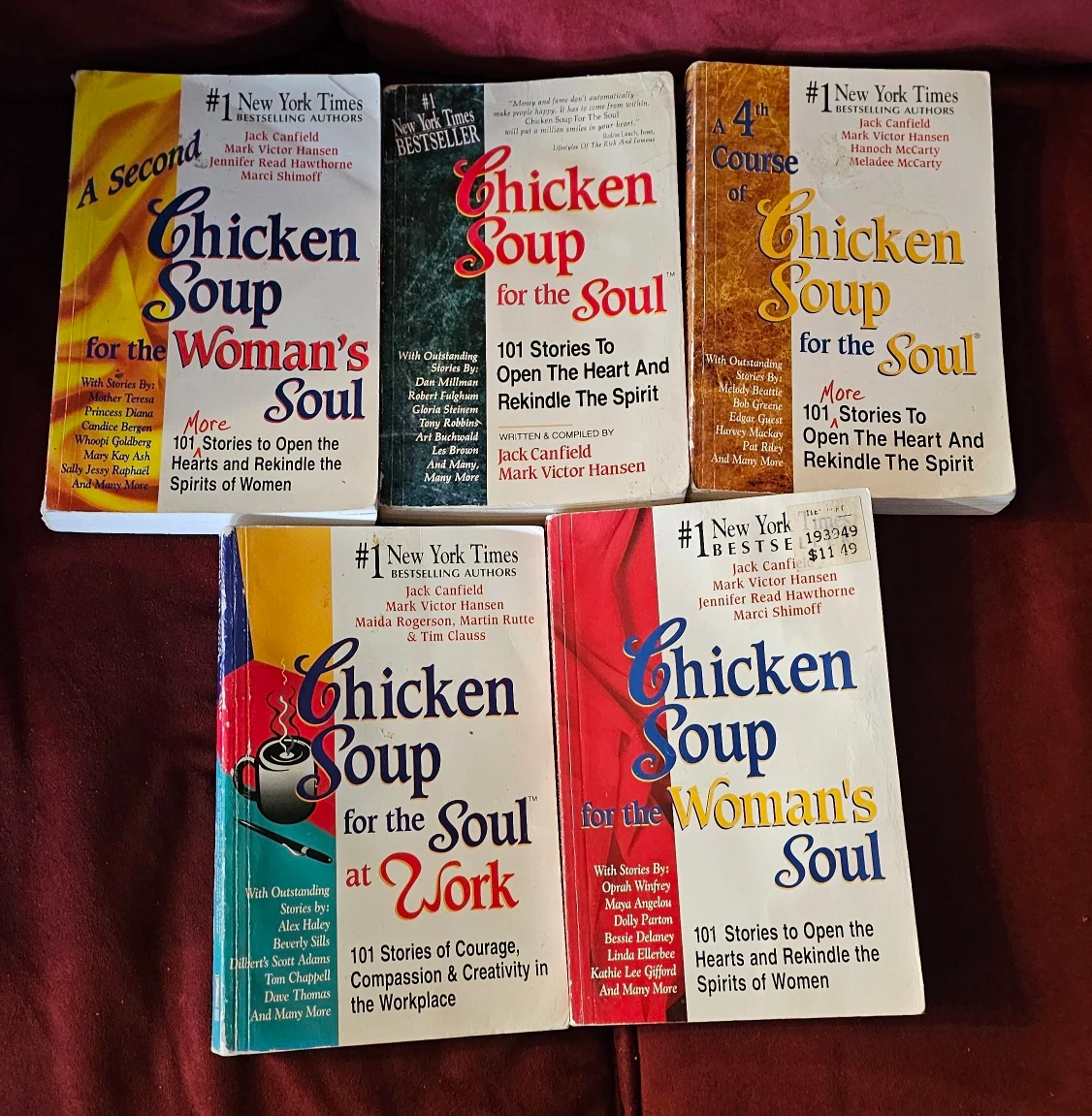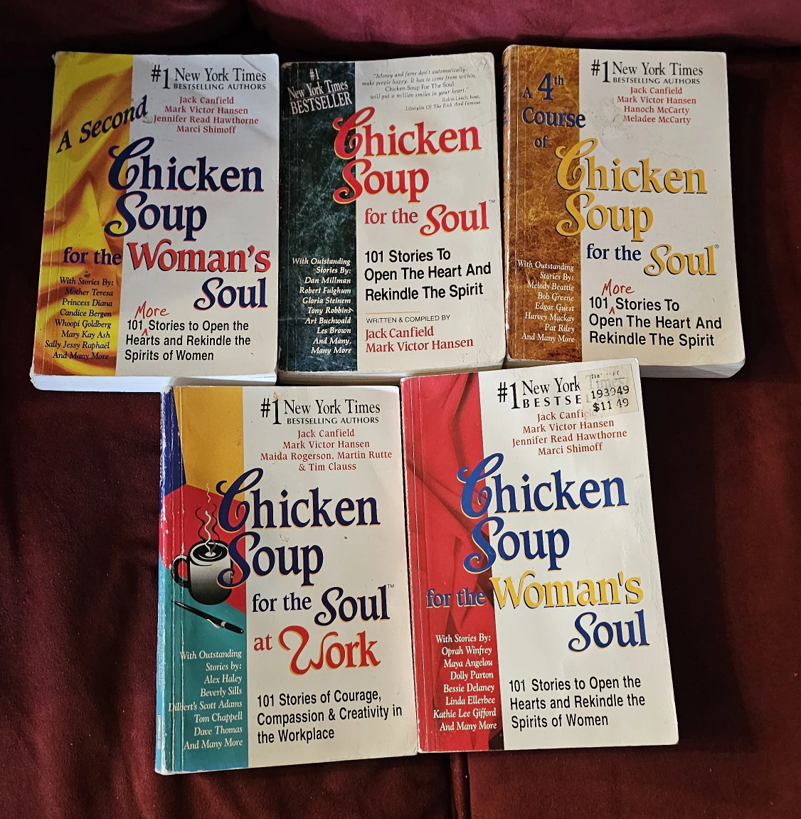 Selling a collection of Chicken Soup for the Soul books! These are great for heartwarming stories and inspiration. Includes various titles like 'Chicken Soup for the Woman's Soul' and 'Chicken Soup for the Soul at Work'. Perfect for anyone who loves a feel-good read