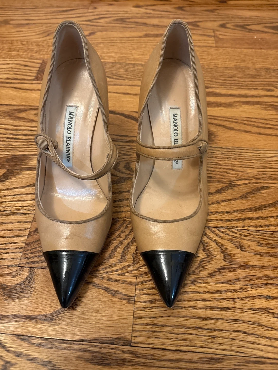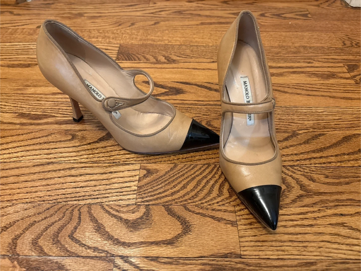 Selling a pair of Manolo Blahnik heels in a lovely beige and black colour. These heels are made of leather and are in great condition. They're perfect for adding a touch of elegance to any outfit!