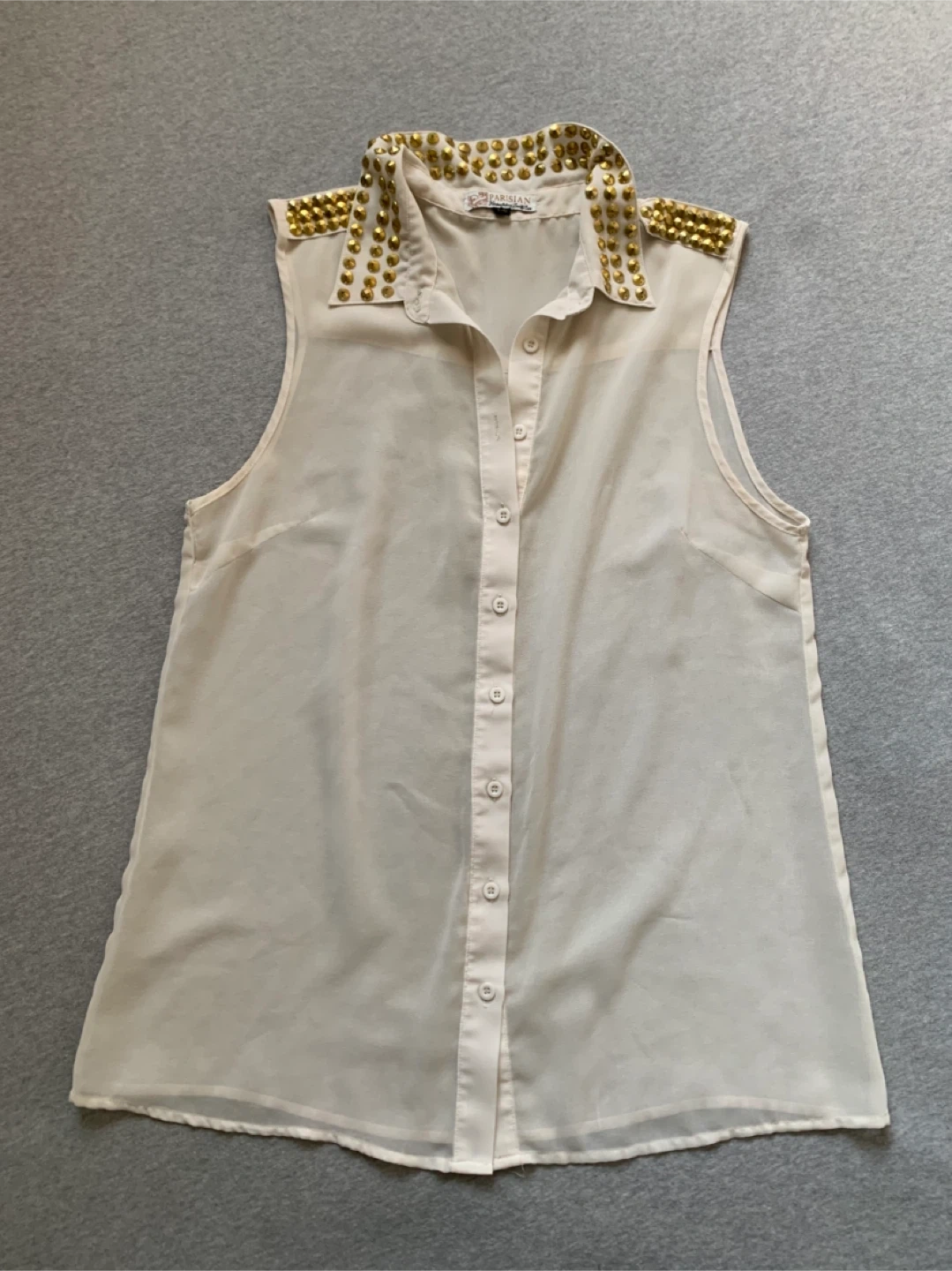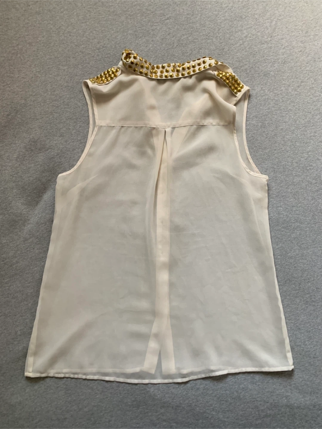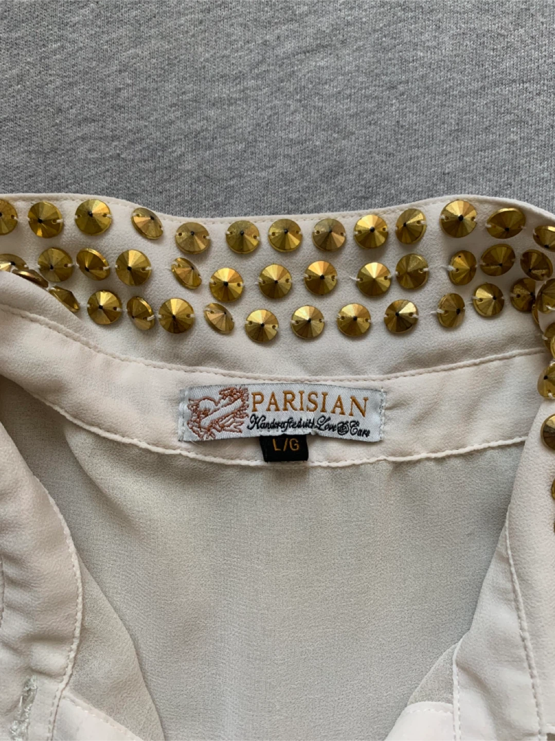 Parisian brand. Sheer ivory/cream colour. It's light and breezy with gold stud detailing around the collar and on the shoulders.