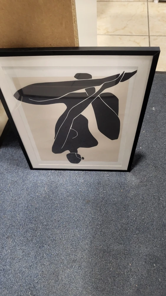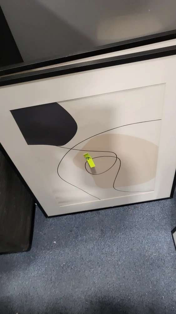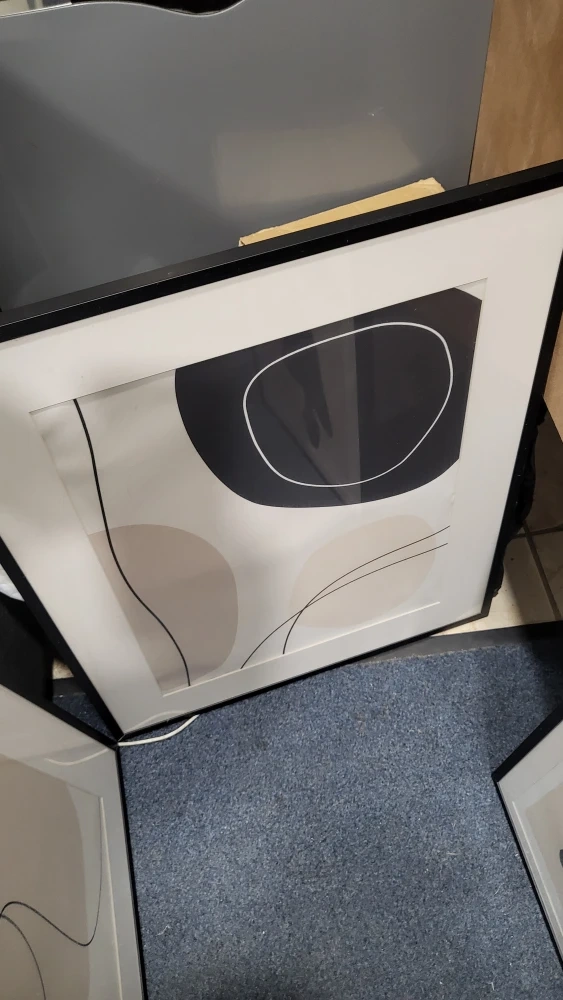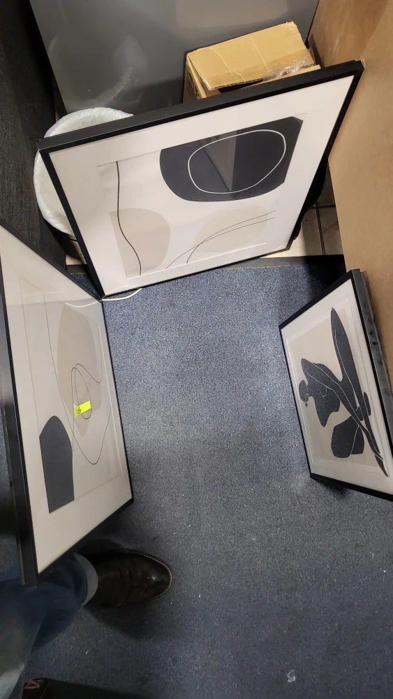 Selling a set of three framed abstract art prints. They feature minimalist designs in neutral tones with black frames. Perfect for adding a modern touch to any room!