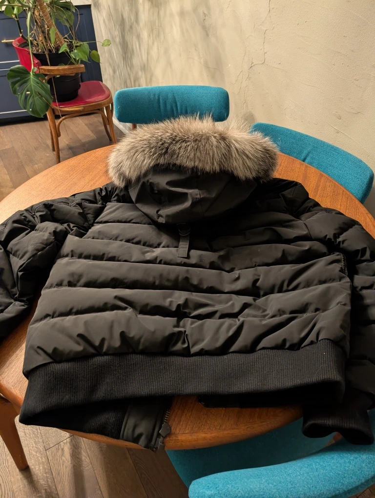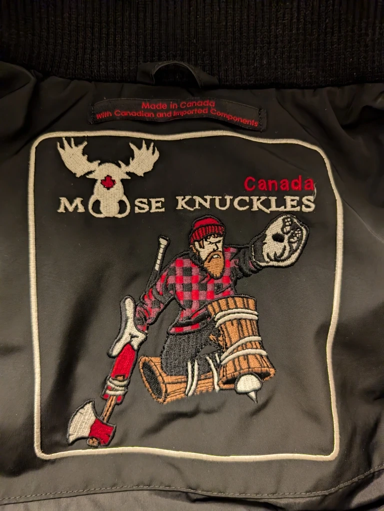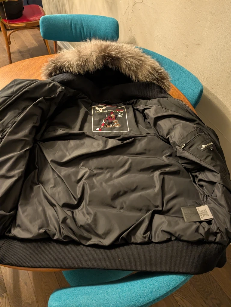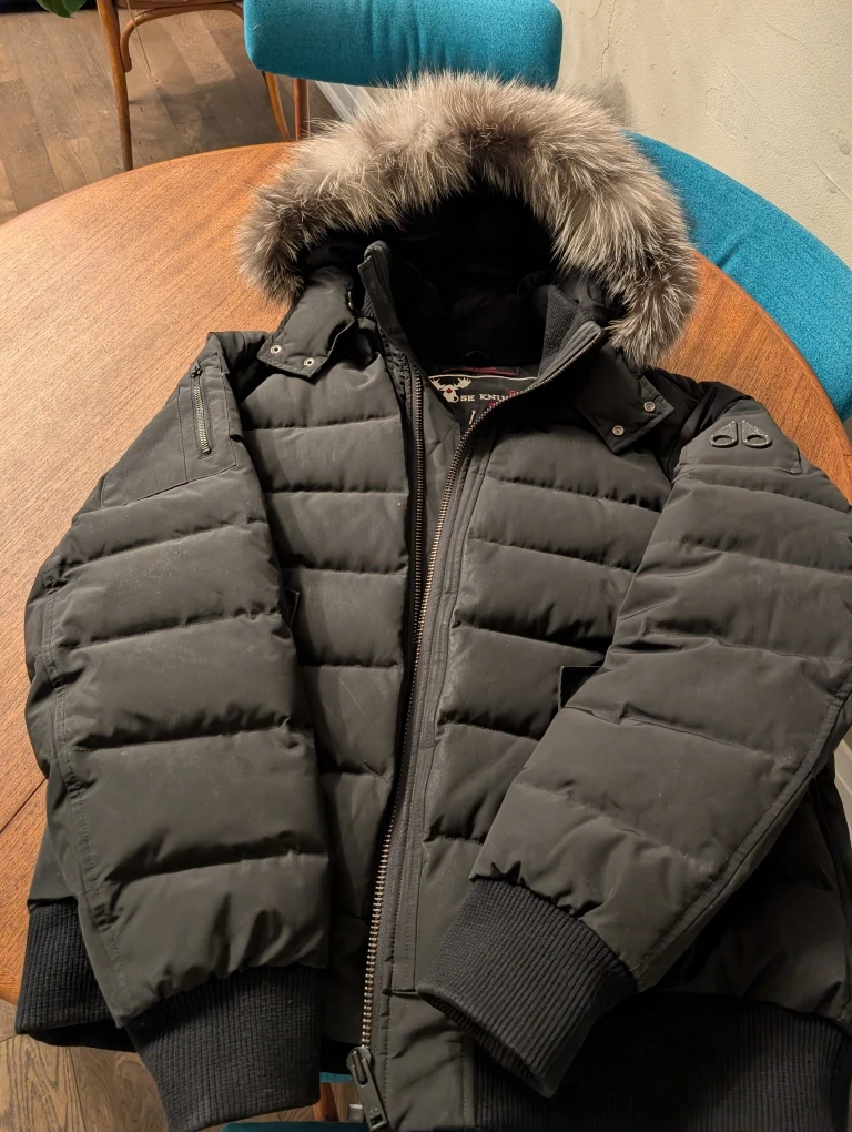 Selling a Moose Knuckles black down bomber jacket. It's in great condition and perfect for the Canadian winter! The jacket features a fur-trimmed hood and the classic Moose Knuckles logo on the sleeve.