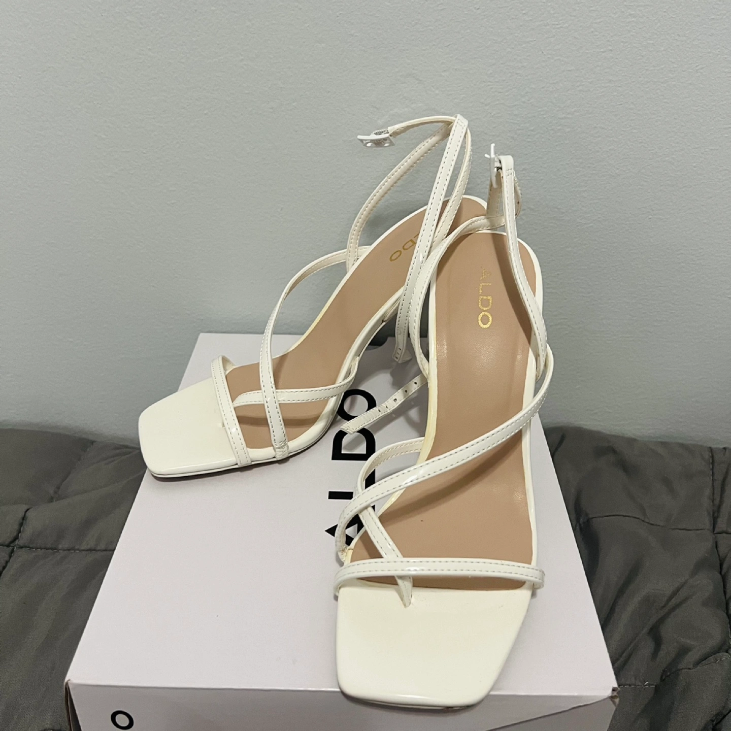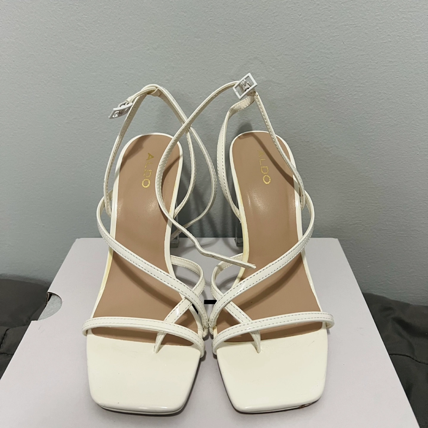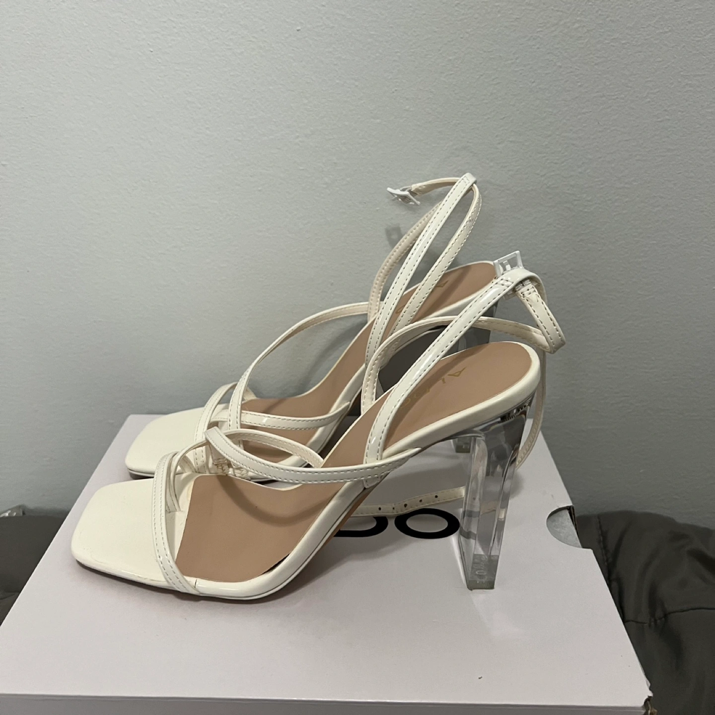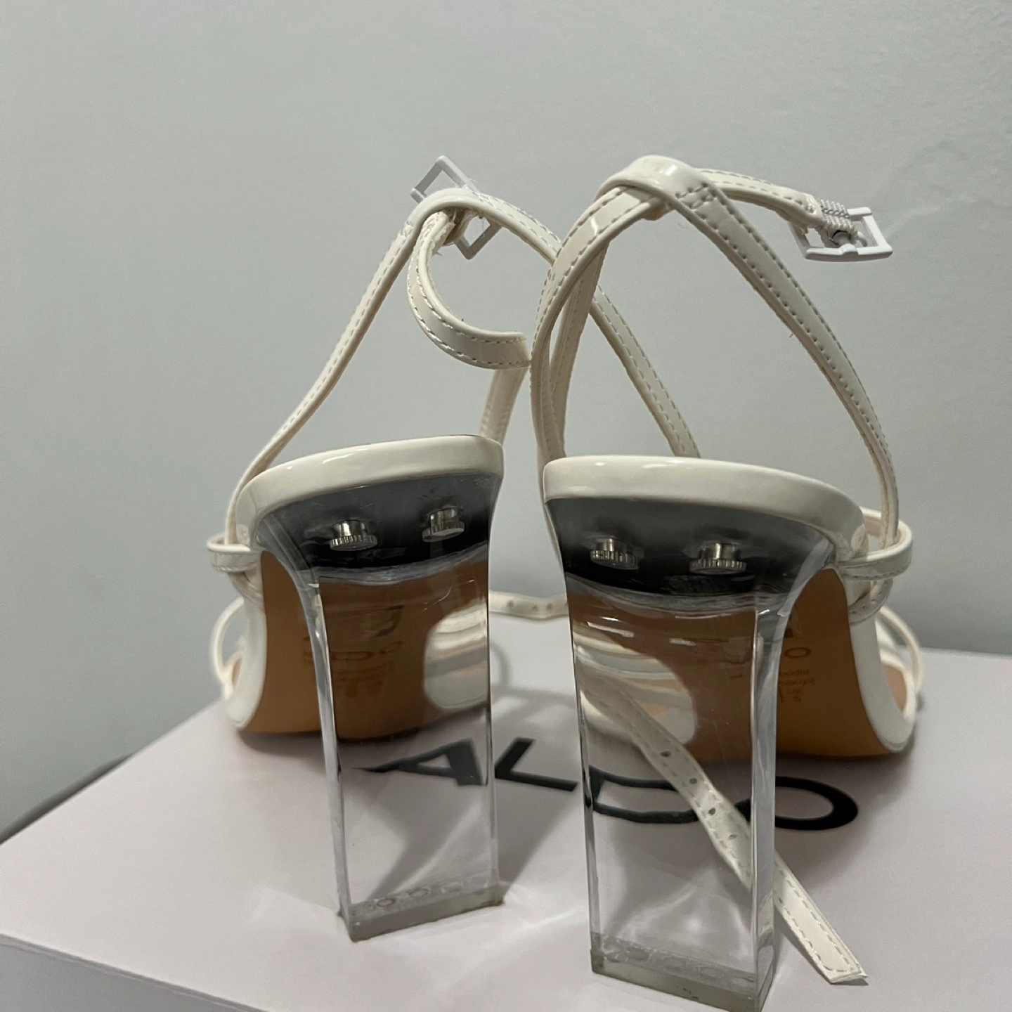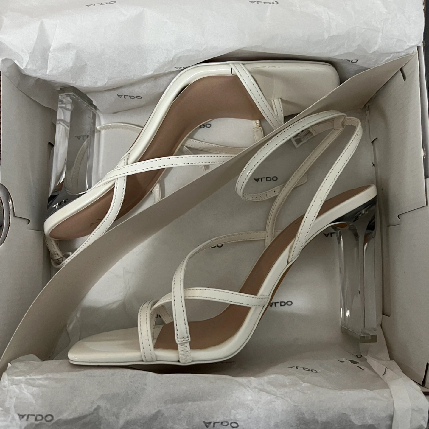 Tags: heels, sandals, white shoes, strap, lace, block heels, clear, square toes, aldo, brand new, four inch,