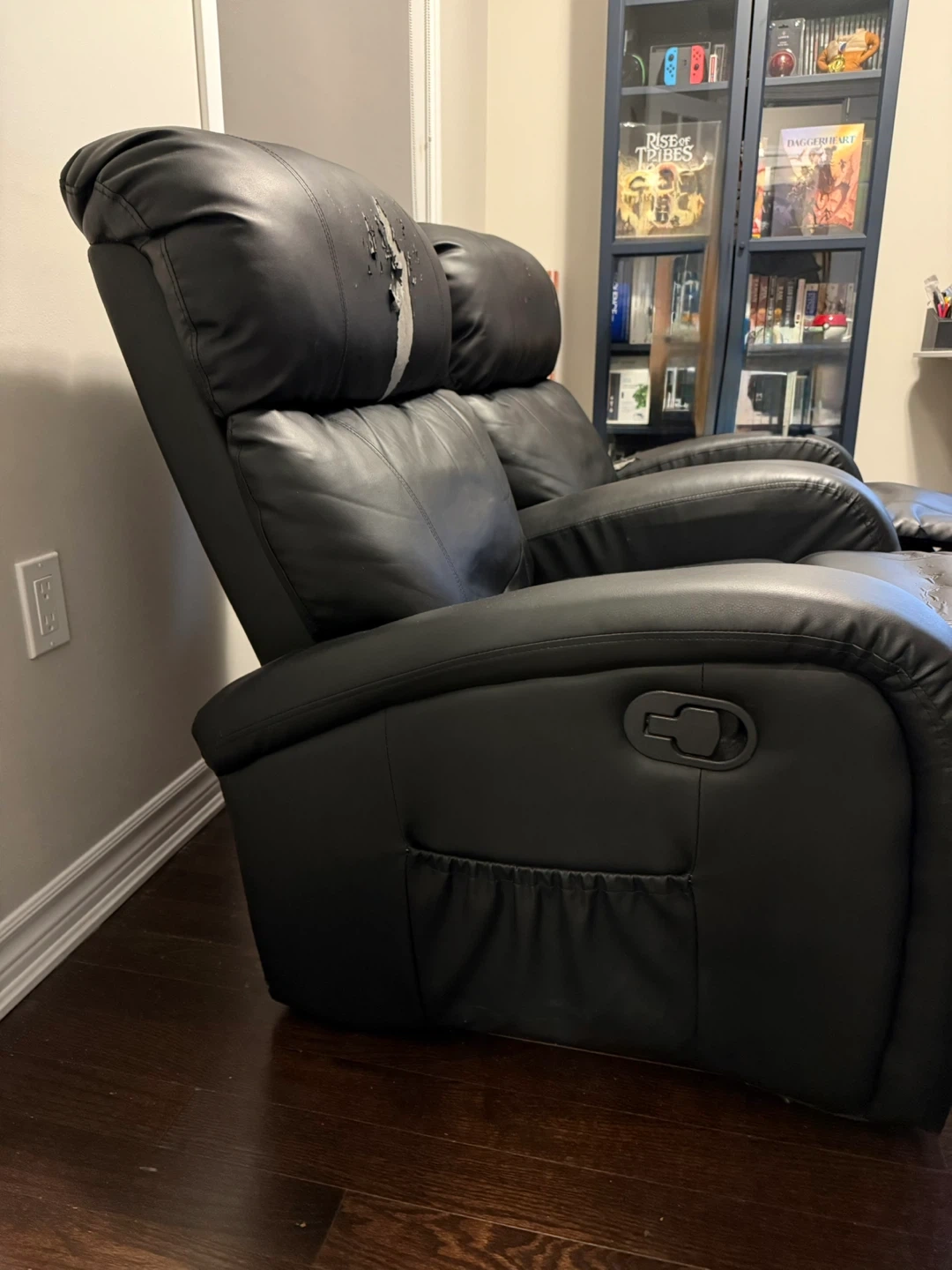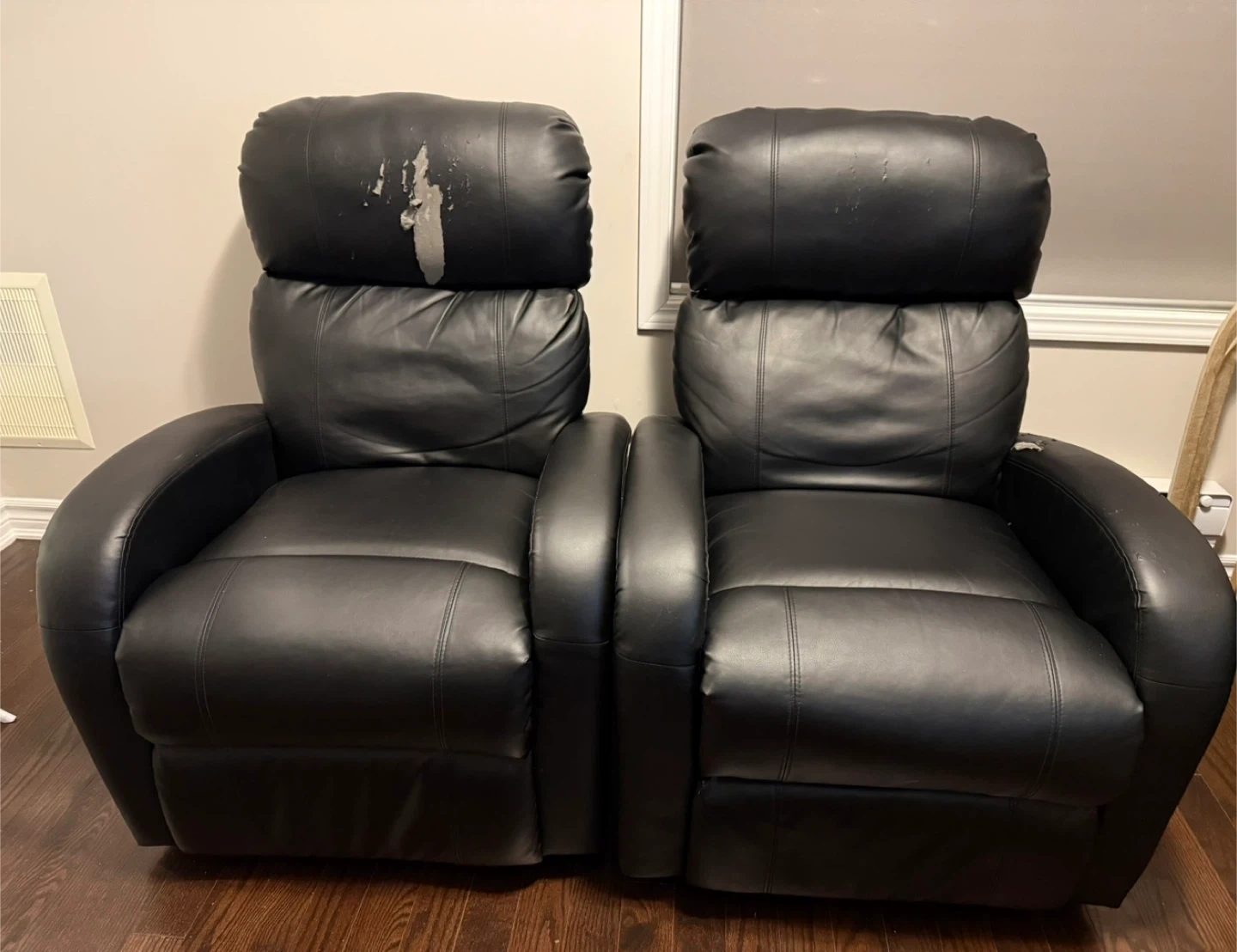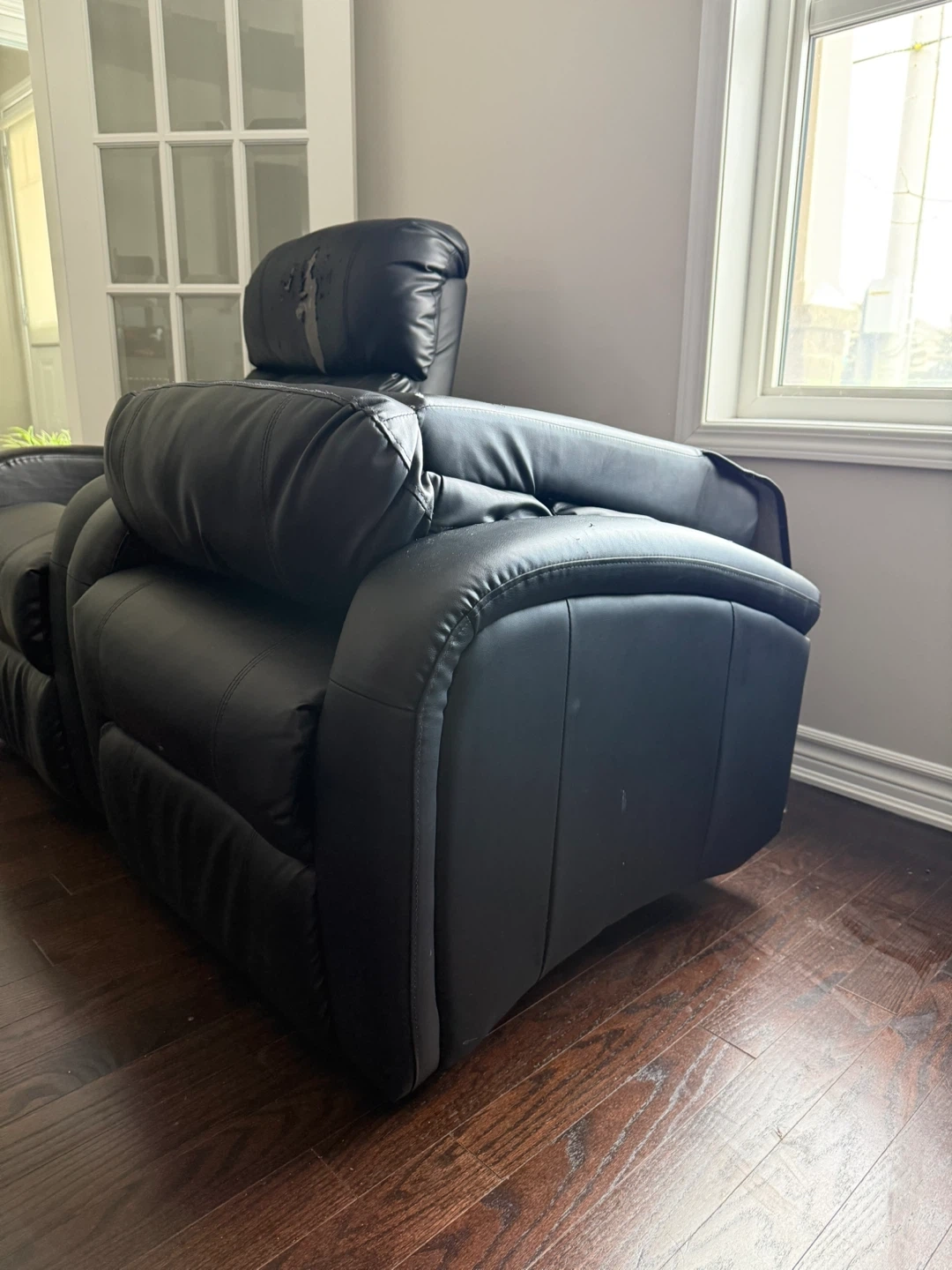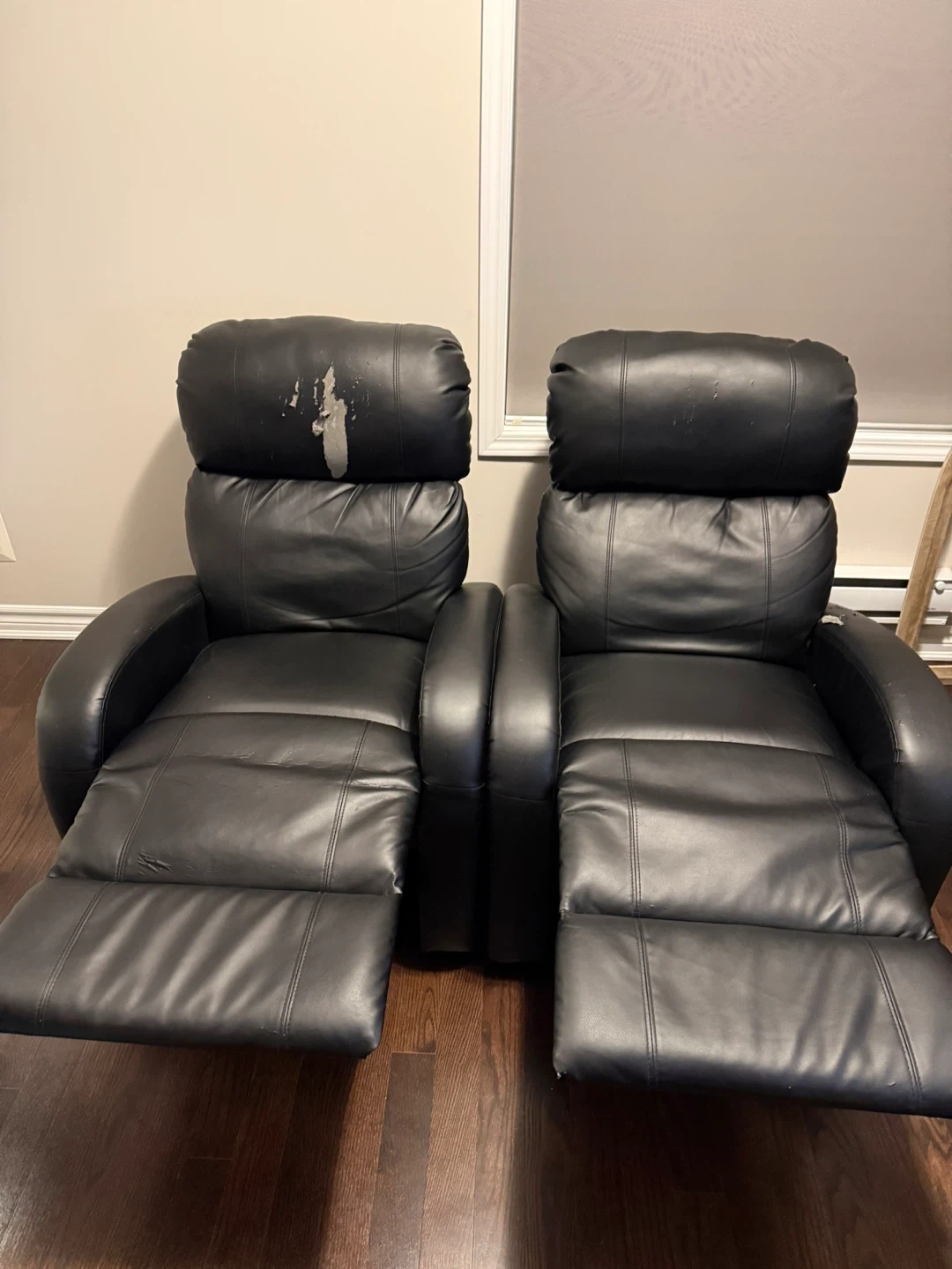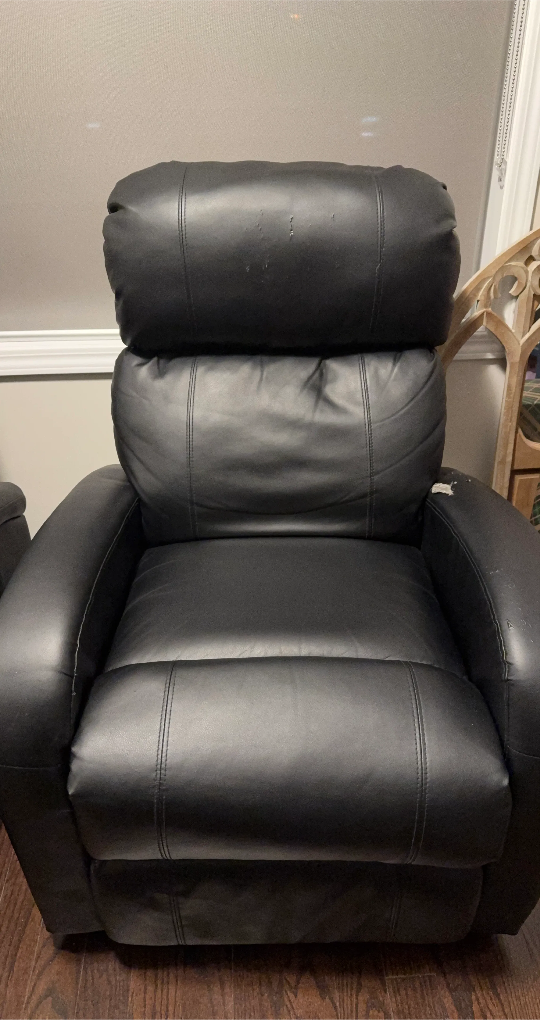 Buy & SellBlack Leather Recliner - Set of TwoBlack Leather Recliner - Set of Two$35Selling a set of two black faux leather recliners. They show signs of wear, as pictured.It has manual lever on the side for reclining.ConditionOkayWHERE TO MEETHomeView MapSELLERverifiedAbhiBronte600 reviews1 chats·0 favorites·83 viewsSEND CHAT TO SELLERHi Abhi! I’m interested in your listing.Hi Abhi! I’m interested in your listing.Get the Karrot app to chatSign In to chat