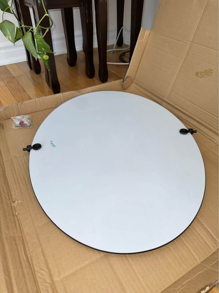 Never been used tilt-able oval wall mirror with cherry hardware, perfect for adding both style and function to any room. Could be made into a tiltable mirror by buying the adjustable arms and wall bracket OR fixed directly to the wall.