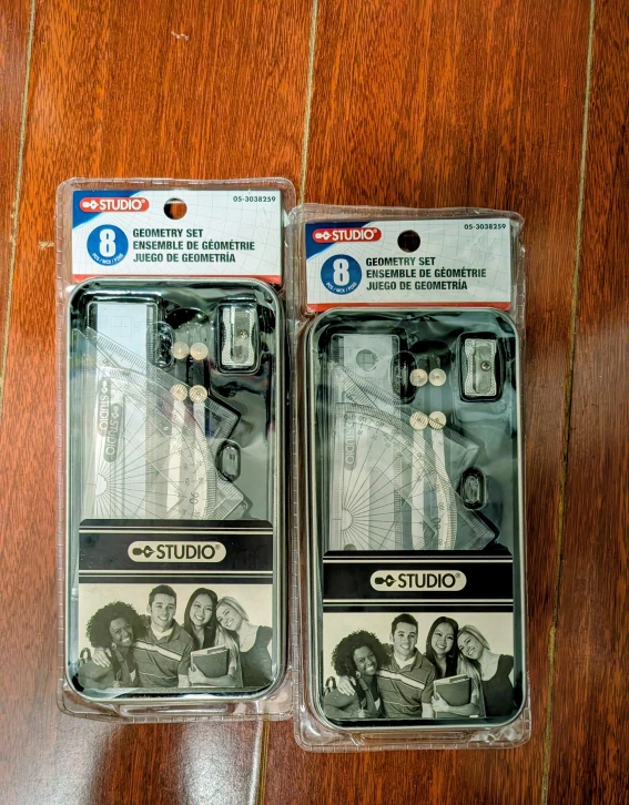 I have two brand new Studio geometry sets for sale! Each set includes 8 pieces, perfect for students or anyone needing precise drawing tools. They're still in their original packaging