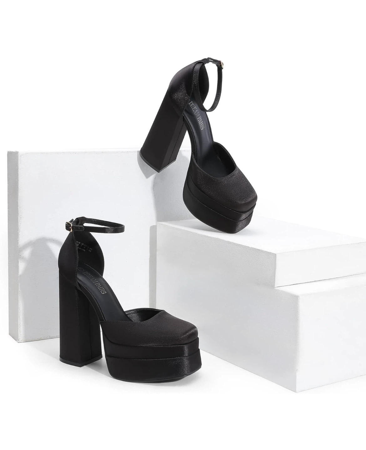 They feature a square-toe design, an ankle strap, and a sturdy chunky heel. The heel height is approximately 5.5 inches. These would be perfect for a night out!