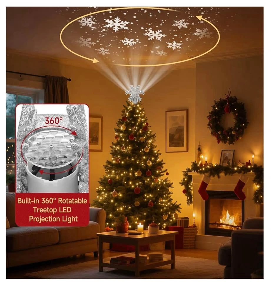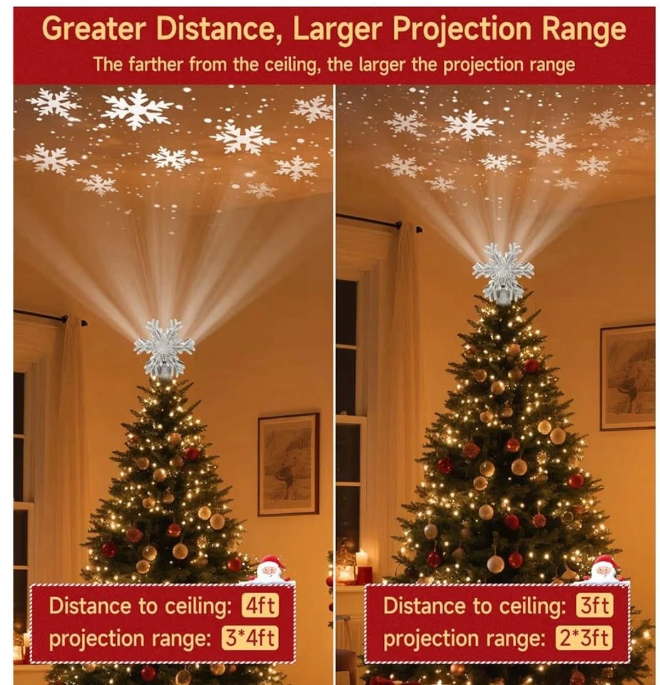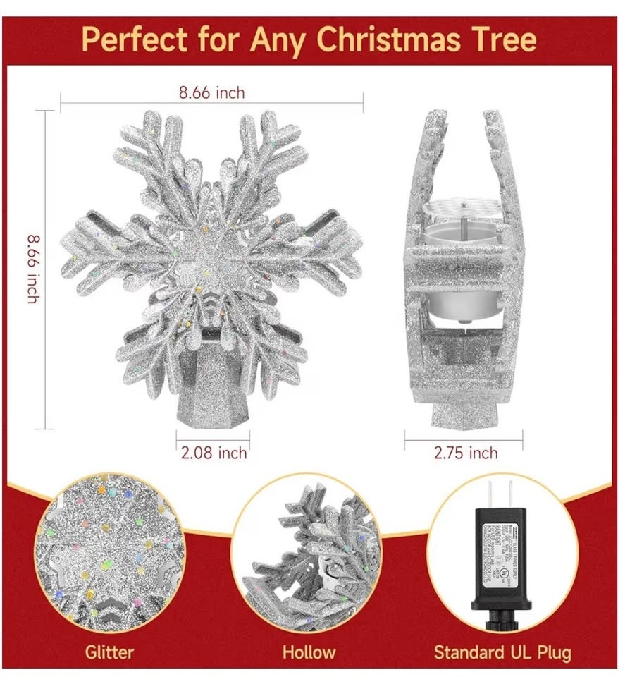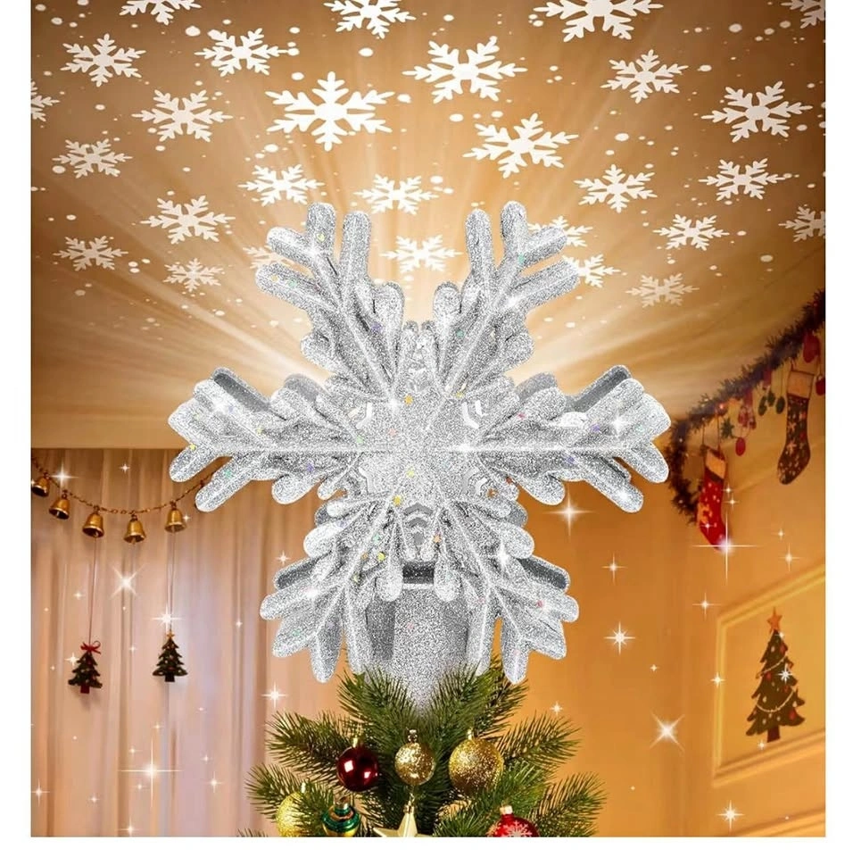 Christmas Tree Topper Lighted with Built-in LED Rotating Snowflake Projector, 3D Hollow Glitter Silver Snowflake Tree Topper for Xmas Party Holiday Christmas Decorations, The Christmas tree topper measures 8.66 inches