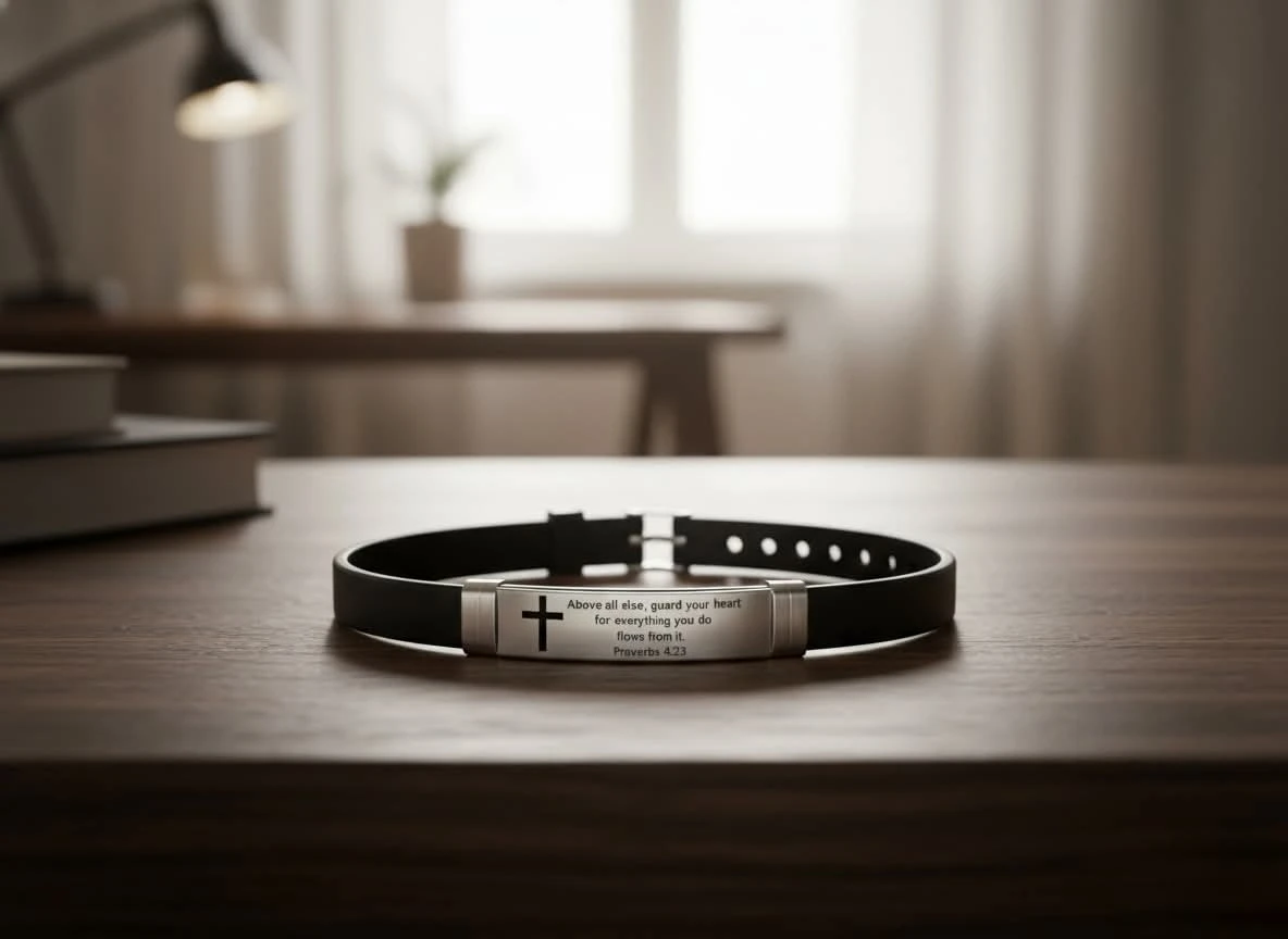 I'm selling a black rubber bracelet that features a silver-tone plate. The plate is engraved with a cross symbol and the Bible verse Proverbs 4:23: "Above all else, guard your heart for everything you do flows from it". It's new #Cleanout