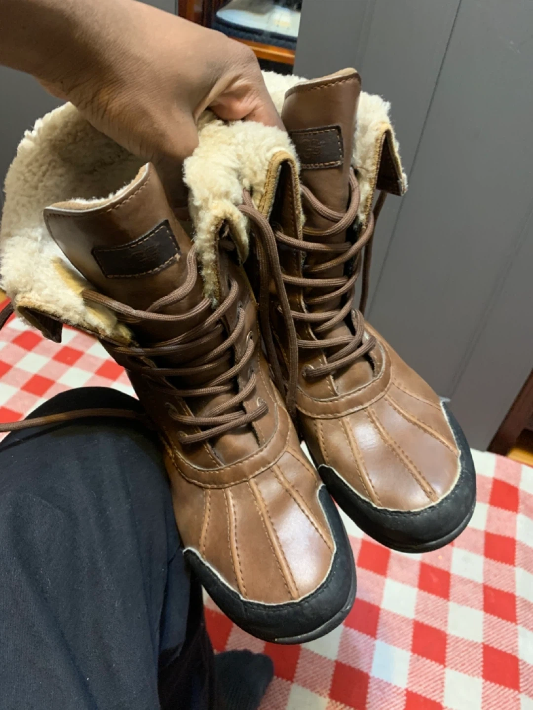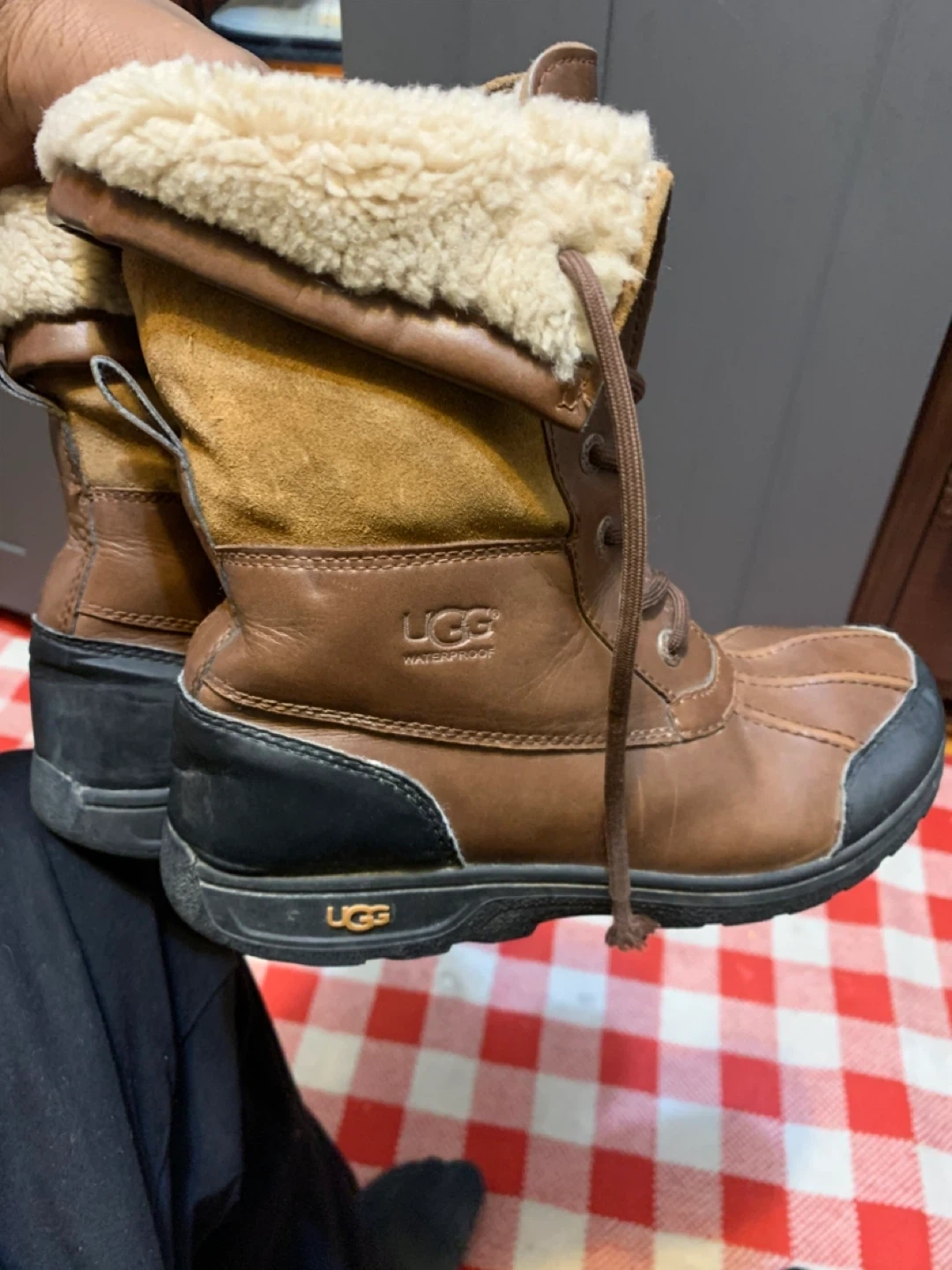 Selling a pair of UGG waterproof leather boots. They have a brown leather exterior with a black rubber sole. The inside is lined with a cozy, cream-coloured fur. They're in good condition and ready for the winter weather!