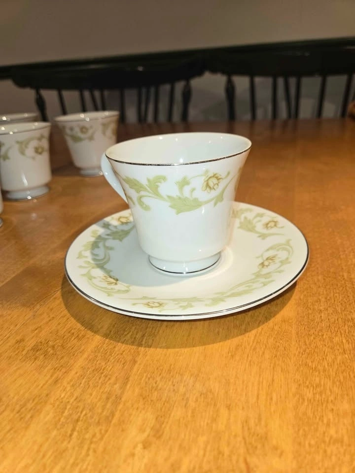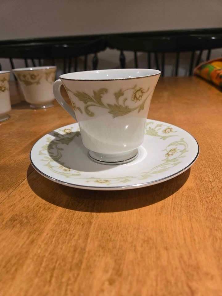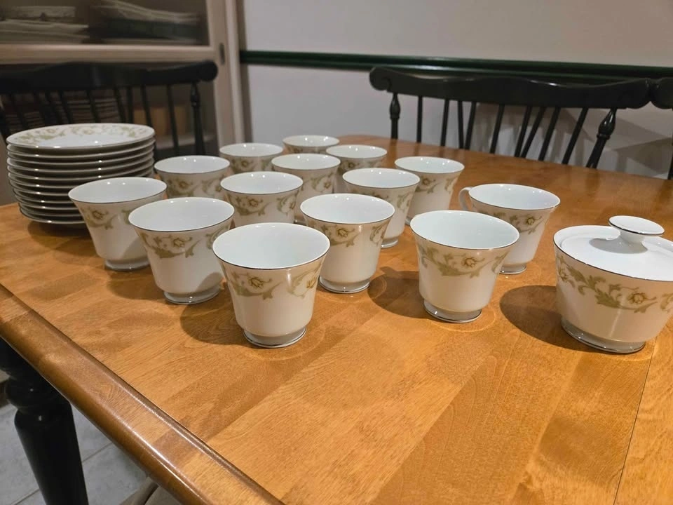 Gently used Mikasa Trousseau (9362, Fine China) set, crafted in Japan. Great condition. Includes 14 cups*, 11 saucers, and 1 sugar bowl with lid. (*two cups have small chip at rim, the rest dont)