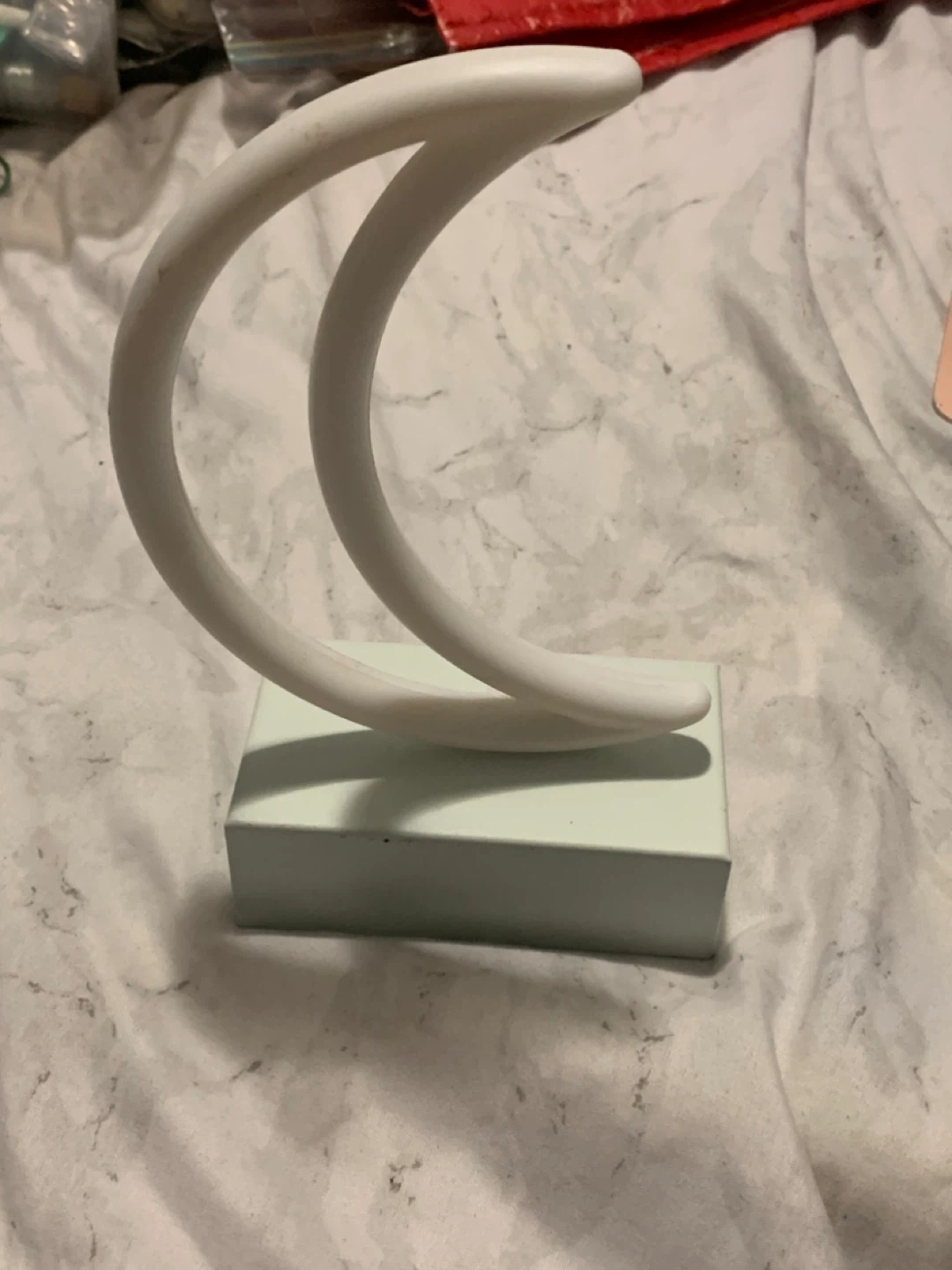A cute crescent moon table lamp! It gives off a lovely soft glow, perfect as a night light. It's in great condition & would look adorable in any room!