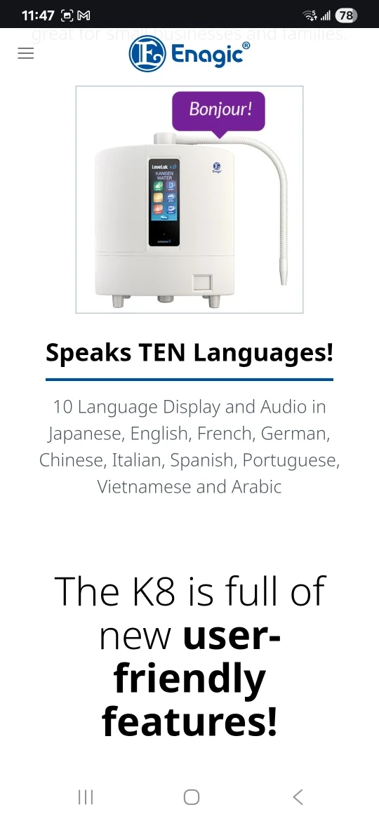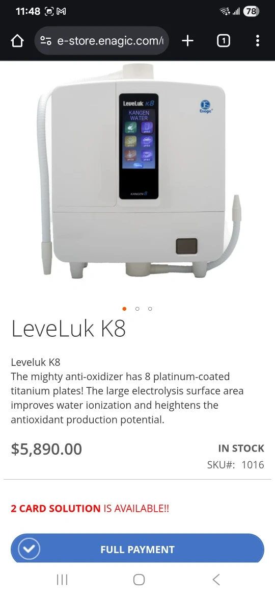 Selling an Enagic LeveLuk K8 water ionizer. This machine speaks ten languages and features a user-friendly design. It has 8 platinum-coated titanium plates for improved water ionization and antioxidant production potential. It can produce strong Kangen water, Kangen water, neutral water, beauty water, and strong acidic water. The original price was $5,890.00